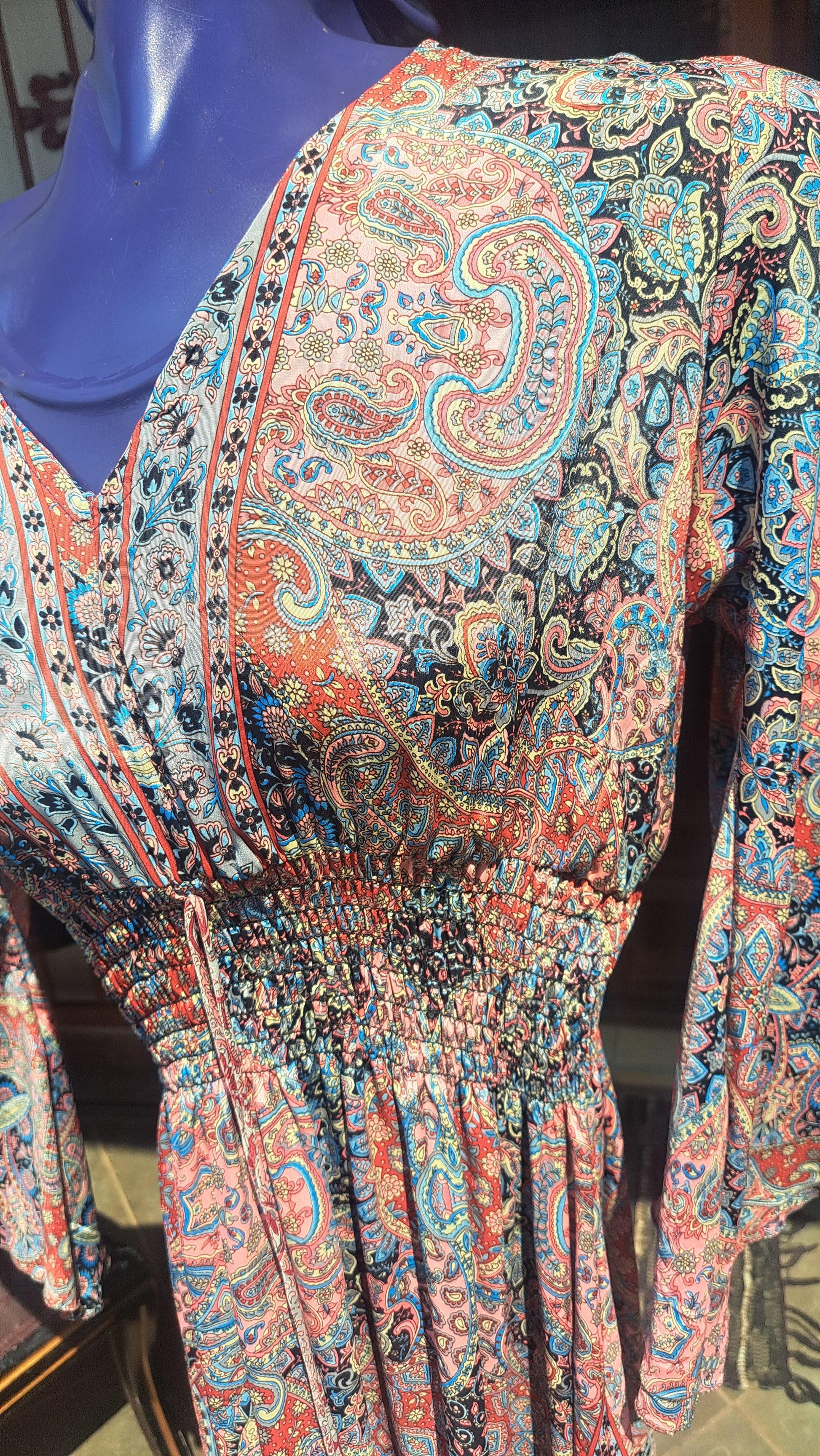 Beautifully sculpted with a flared sleeve and rouged waist. Be the Belle of the Ball in this Gracious Goddess cut in shades of Apricot with gold leafing detail.