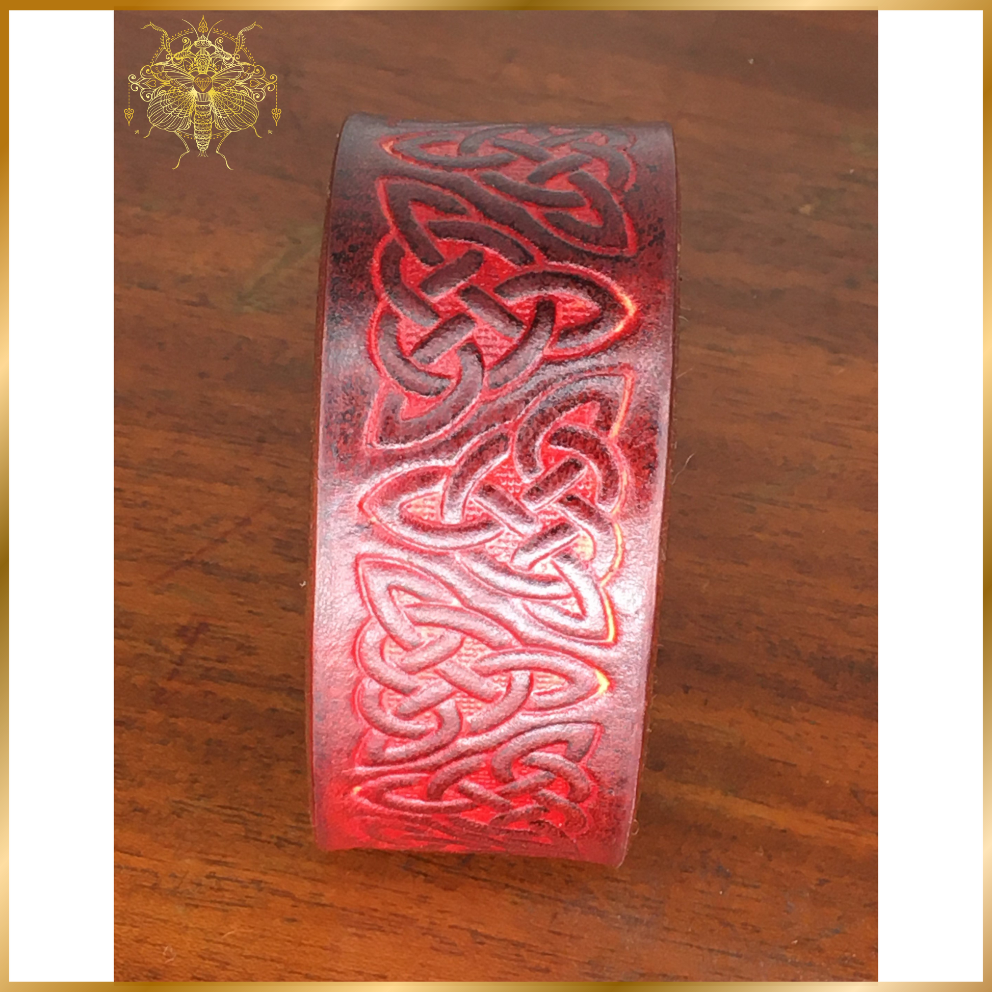 Ox Blood / Maroon, wide cuffed bracelet with 9 Celtic triangular knots..