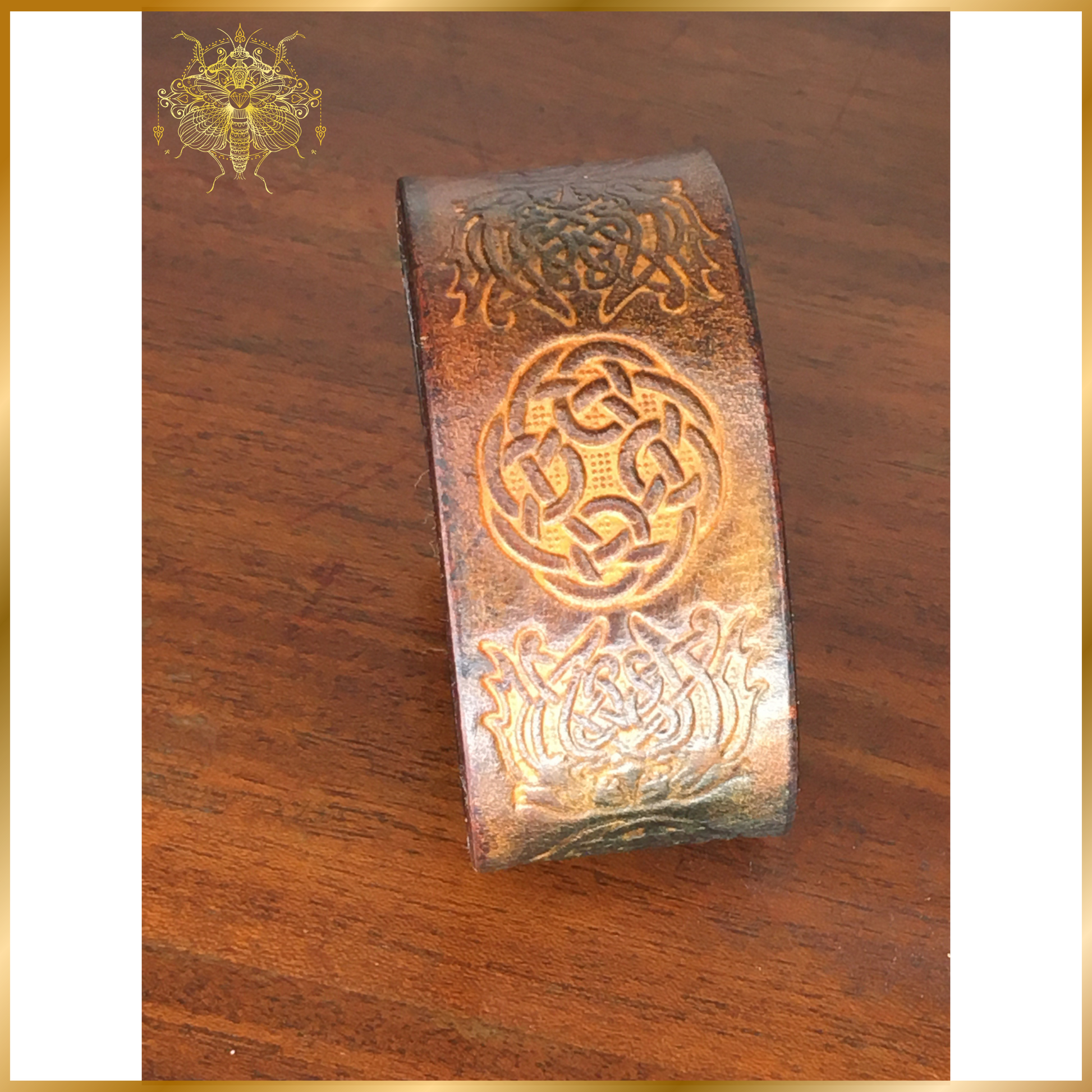 Tanned Brown, wide cuffed bracelet with different Celtic Knots