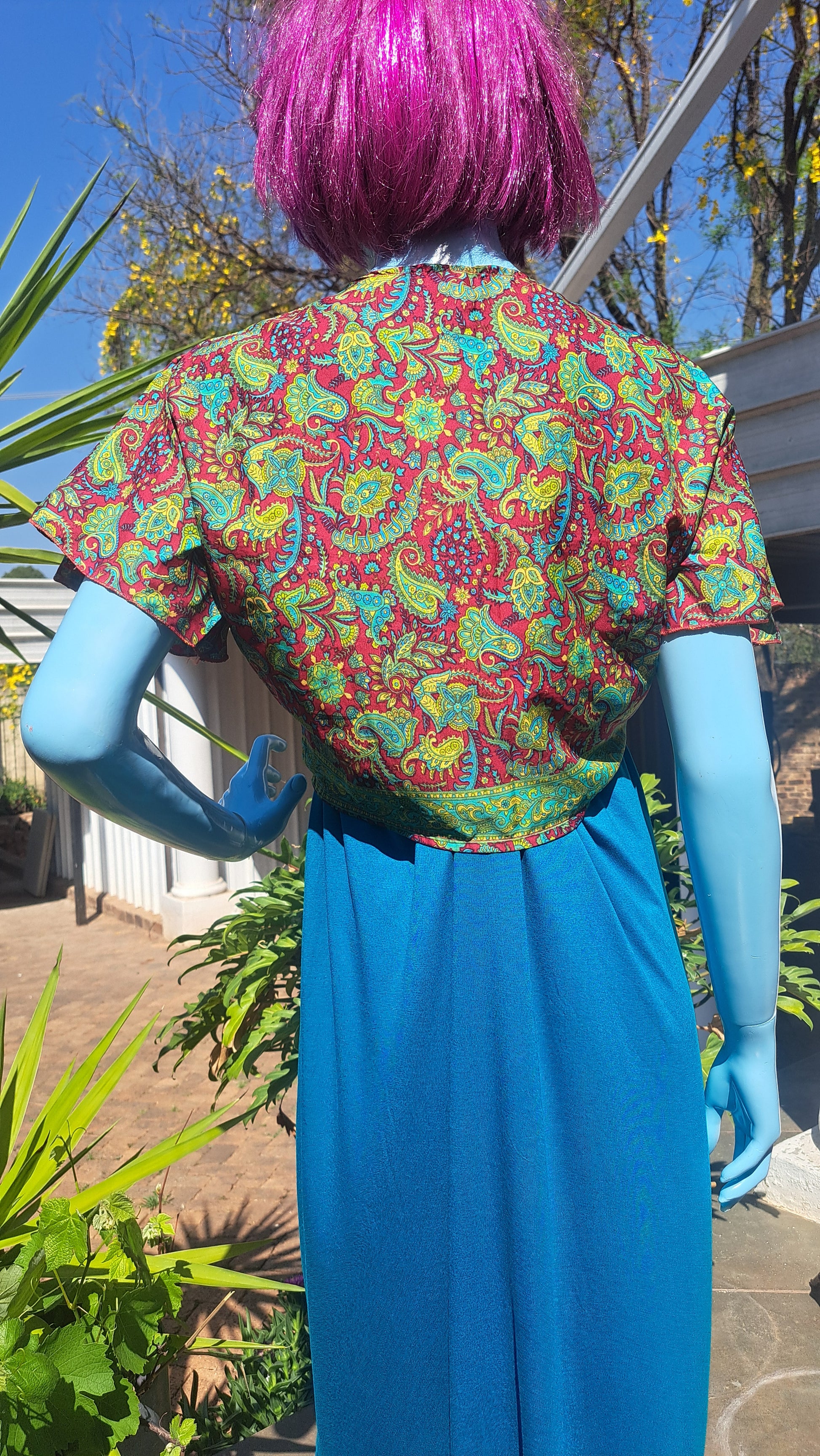 A Silky soft tie top in a vibrant colour combo. Short little fairy sleeve. Play with the looks. Pair with a denim, over a plain dress, with a wide skirt. Live it up Gypsy girl!