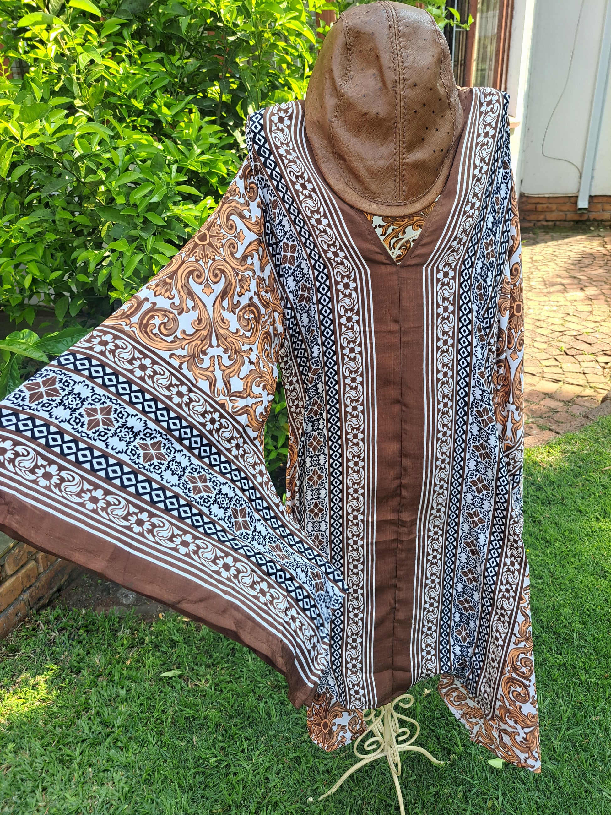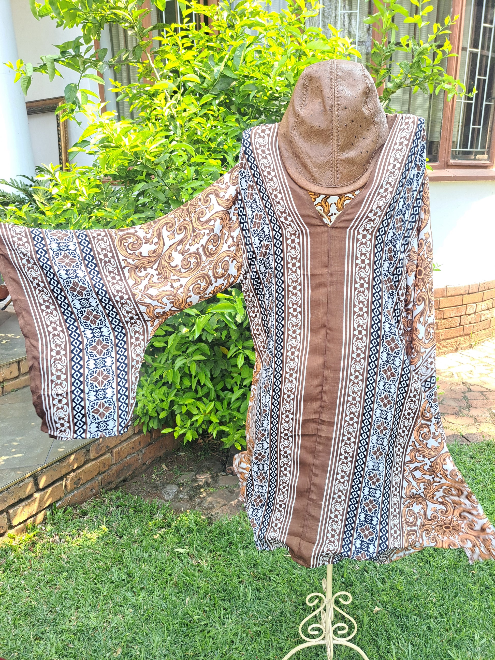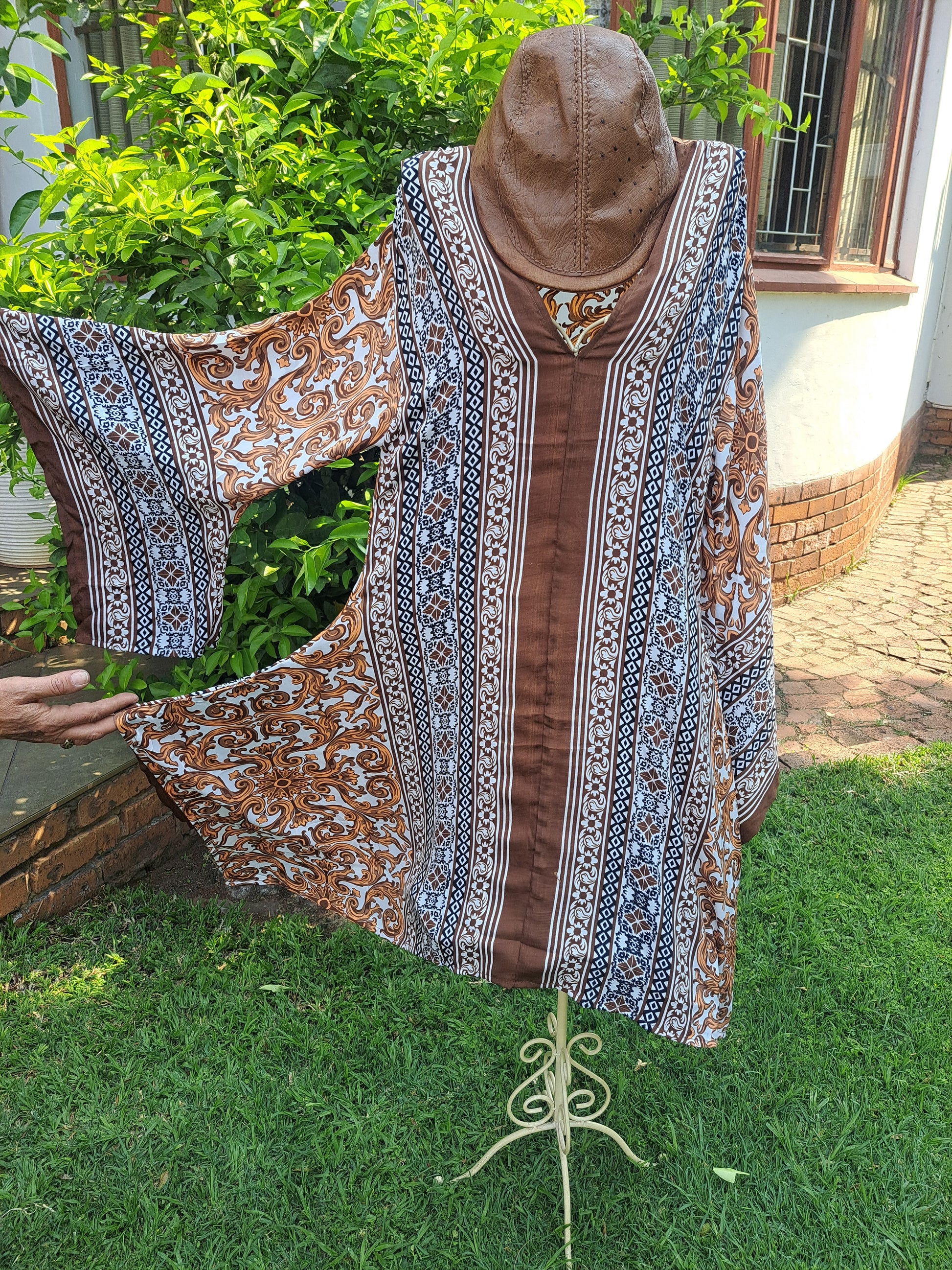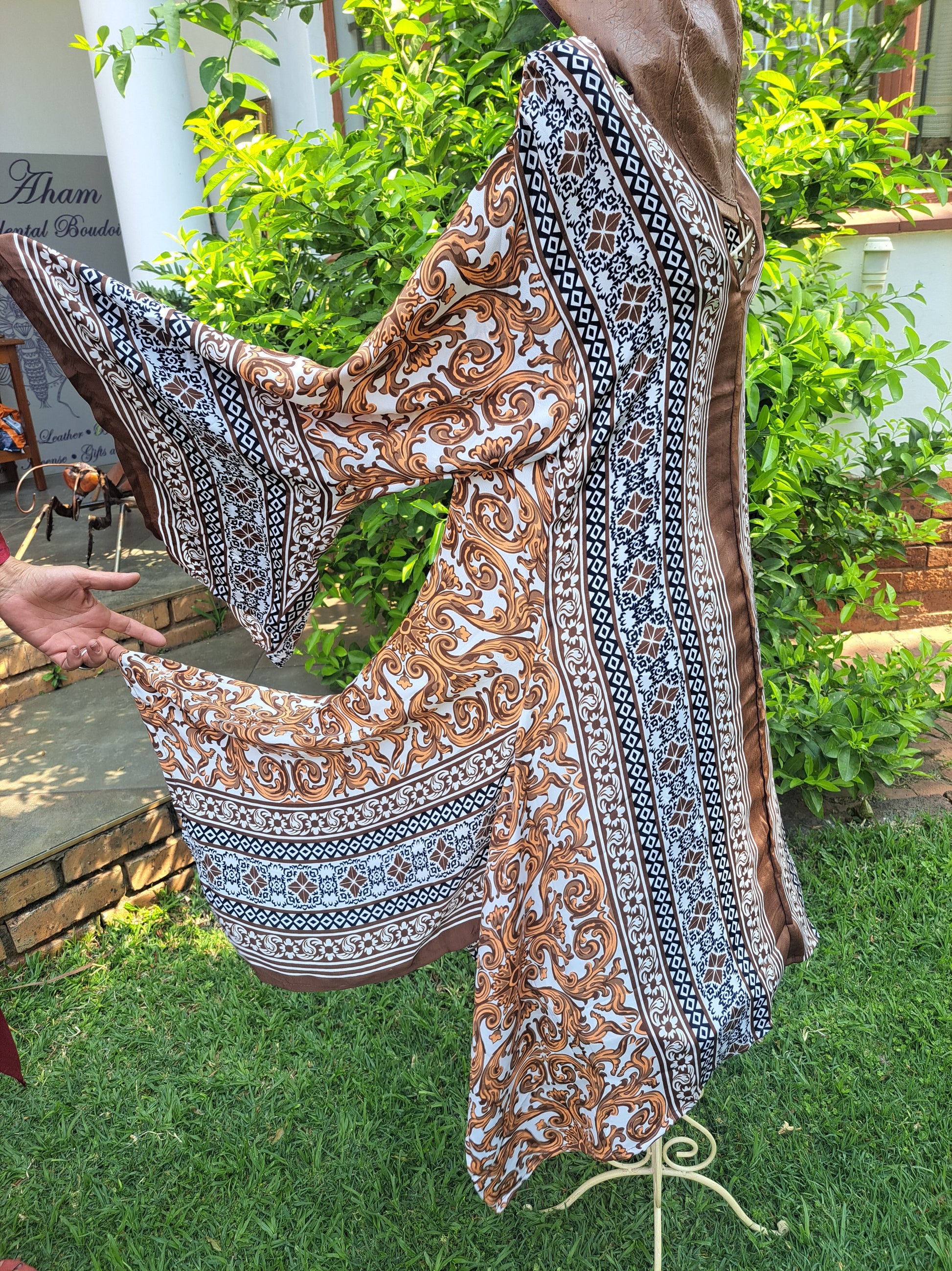 Angel sleeves in golden filigree detail surrounded by chocolate and copper geomettic prints. Slip her over your swimwear, to the boardroom with elegant slacks or to a wedding when you add a golden skirt. Elegant, feminine and timeless.