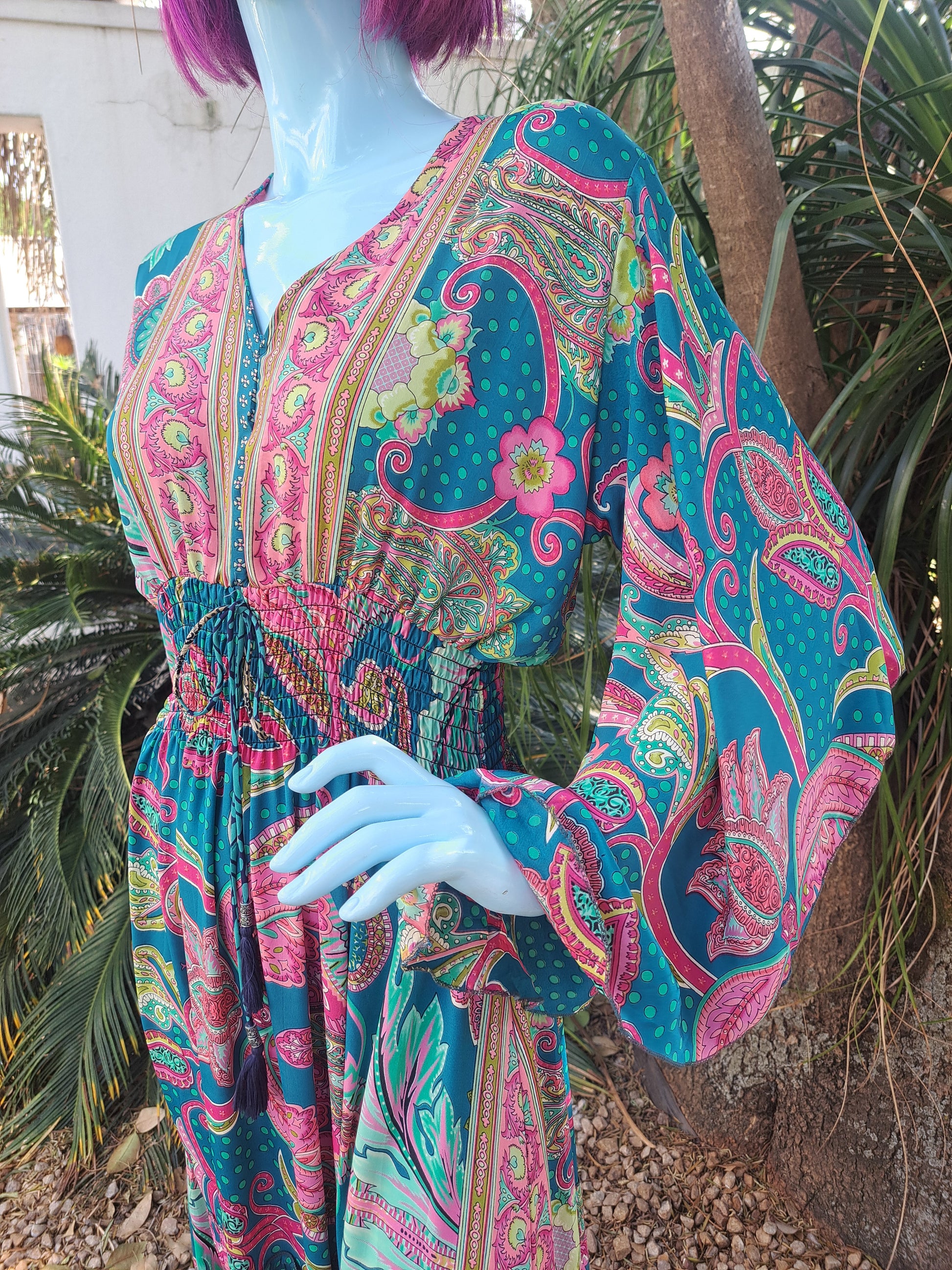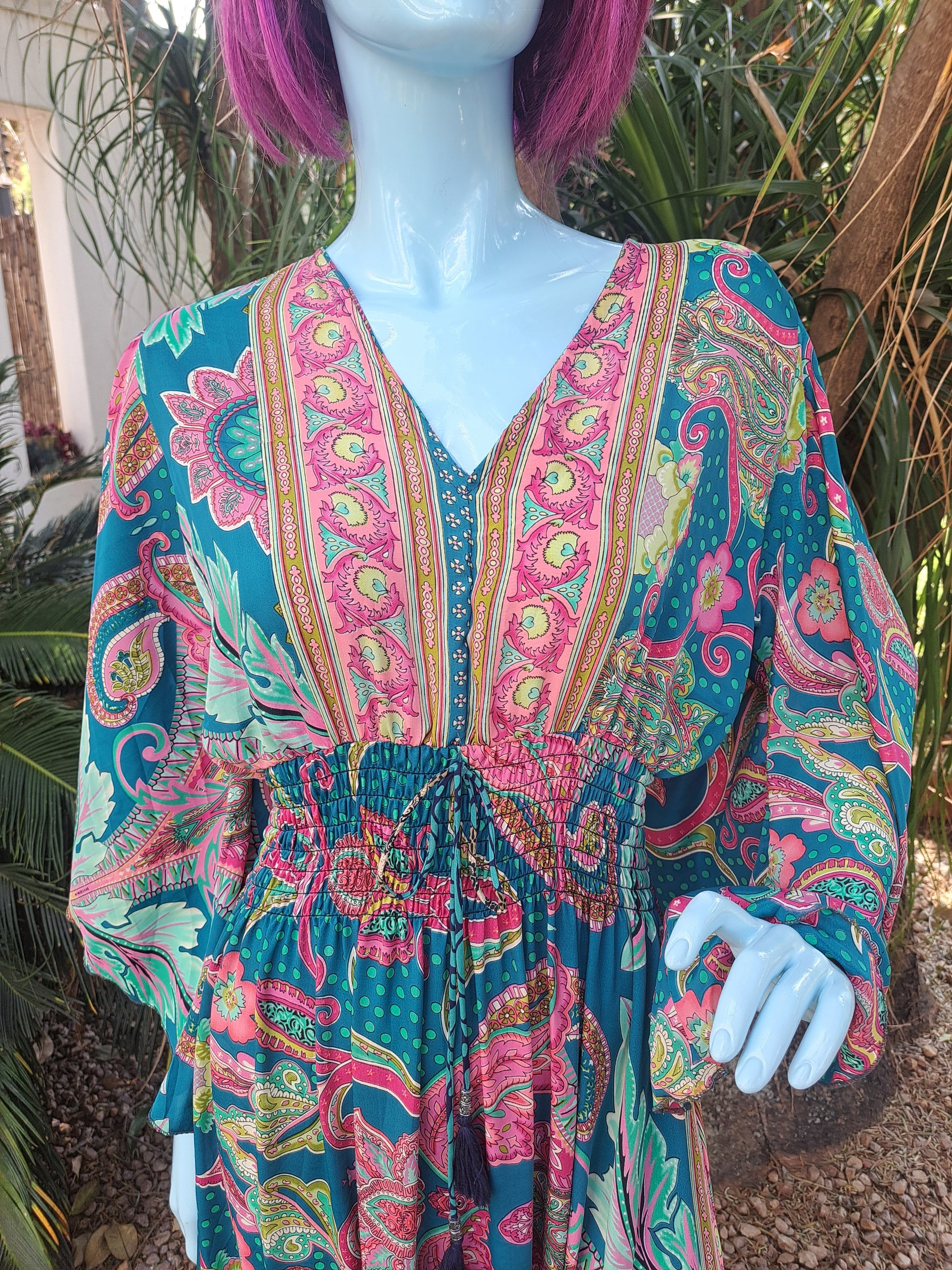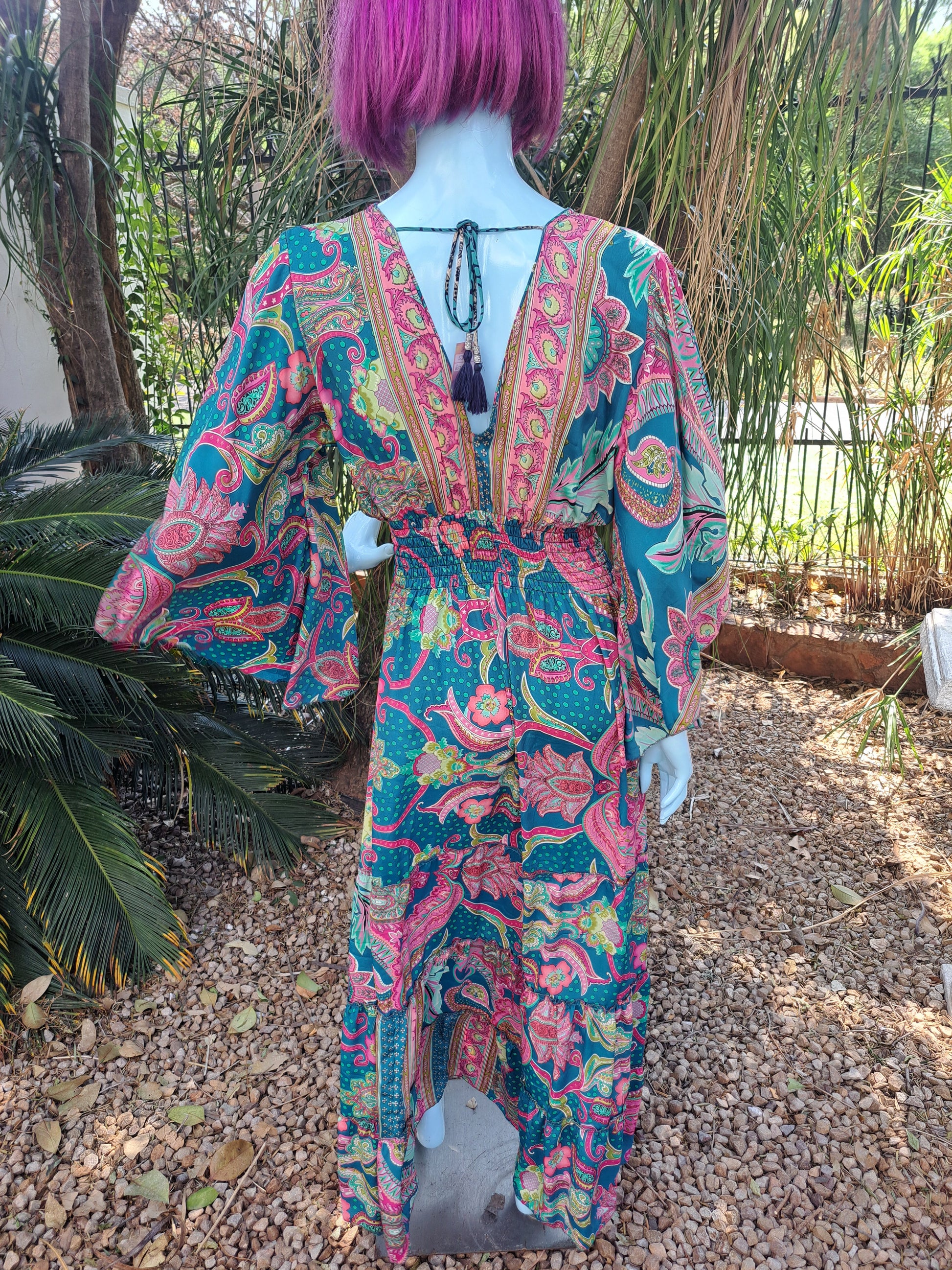 Beautifully sculpted with a flared sleeve and rouged waist. Be the Belle of the Ball in this Gracious Goddess cut in Emerald and Pink with gold leafing detail.