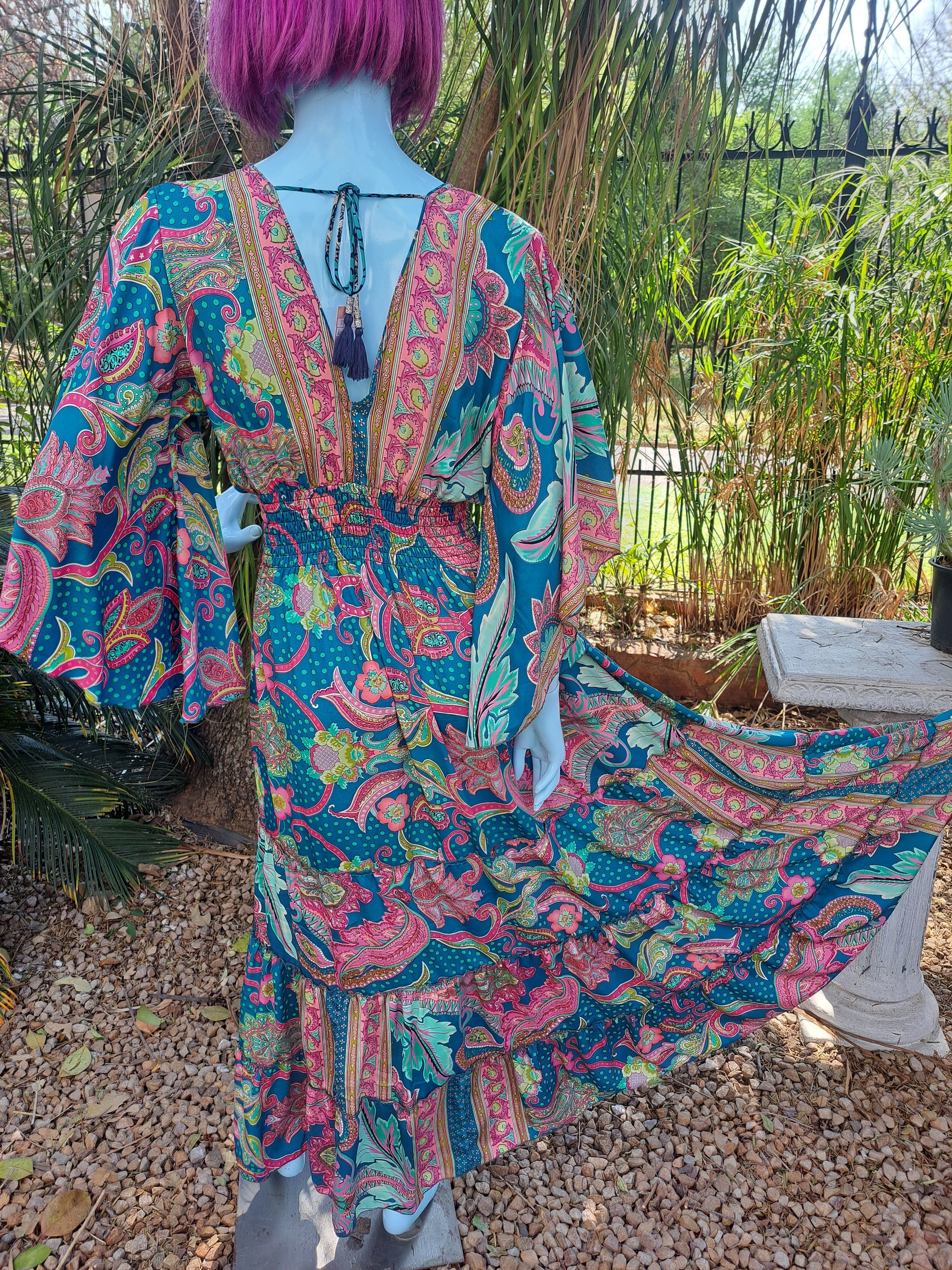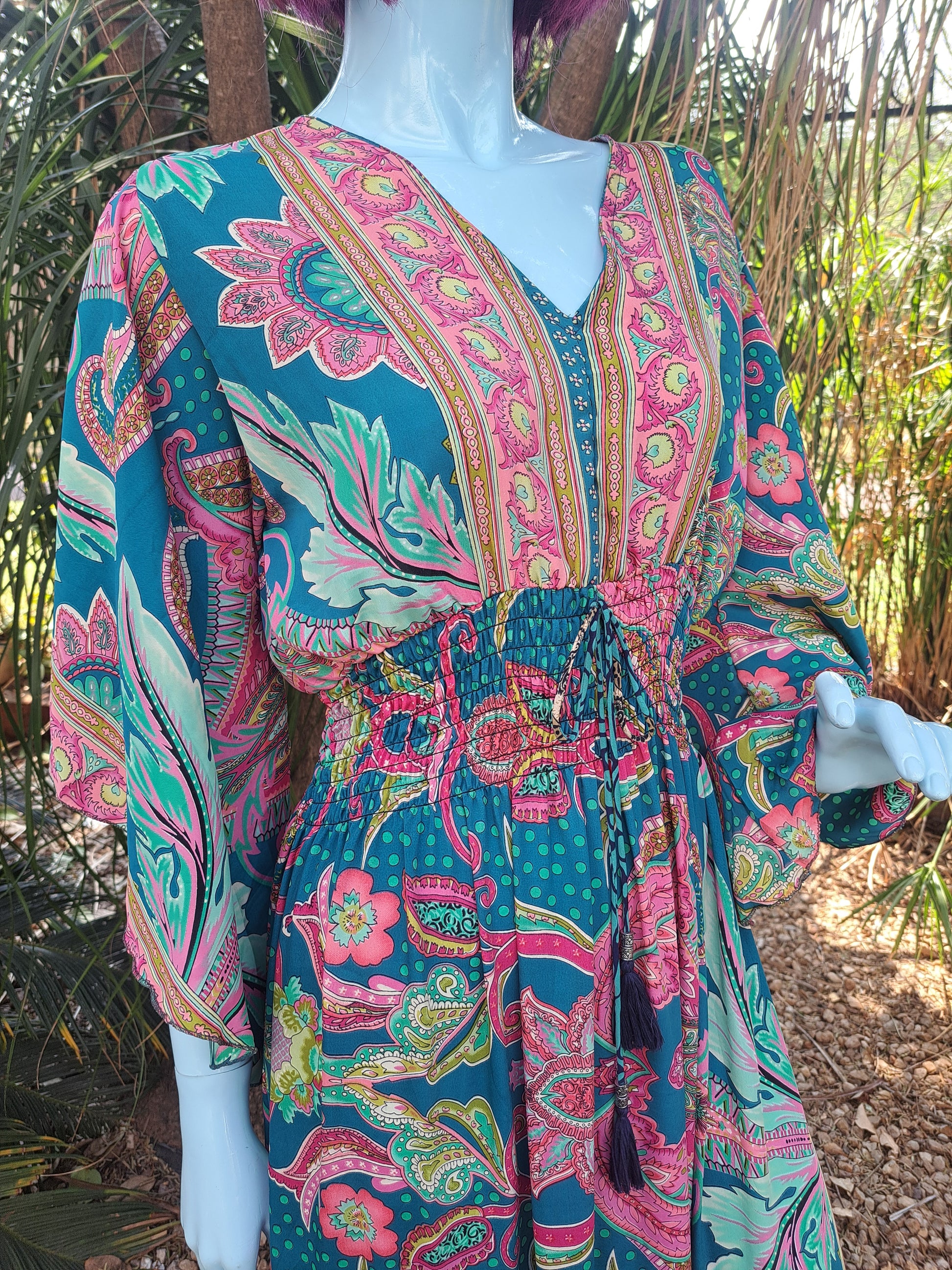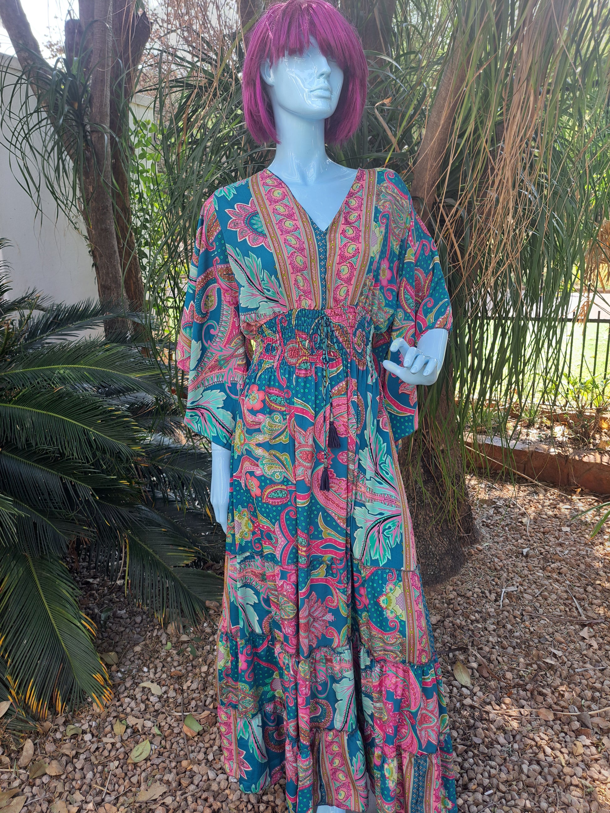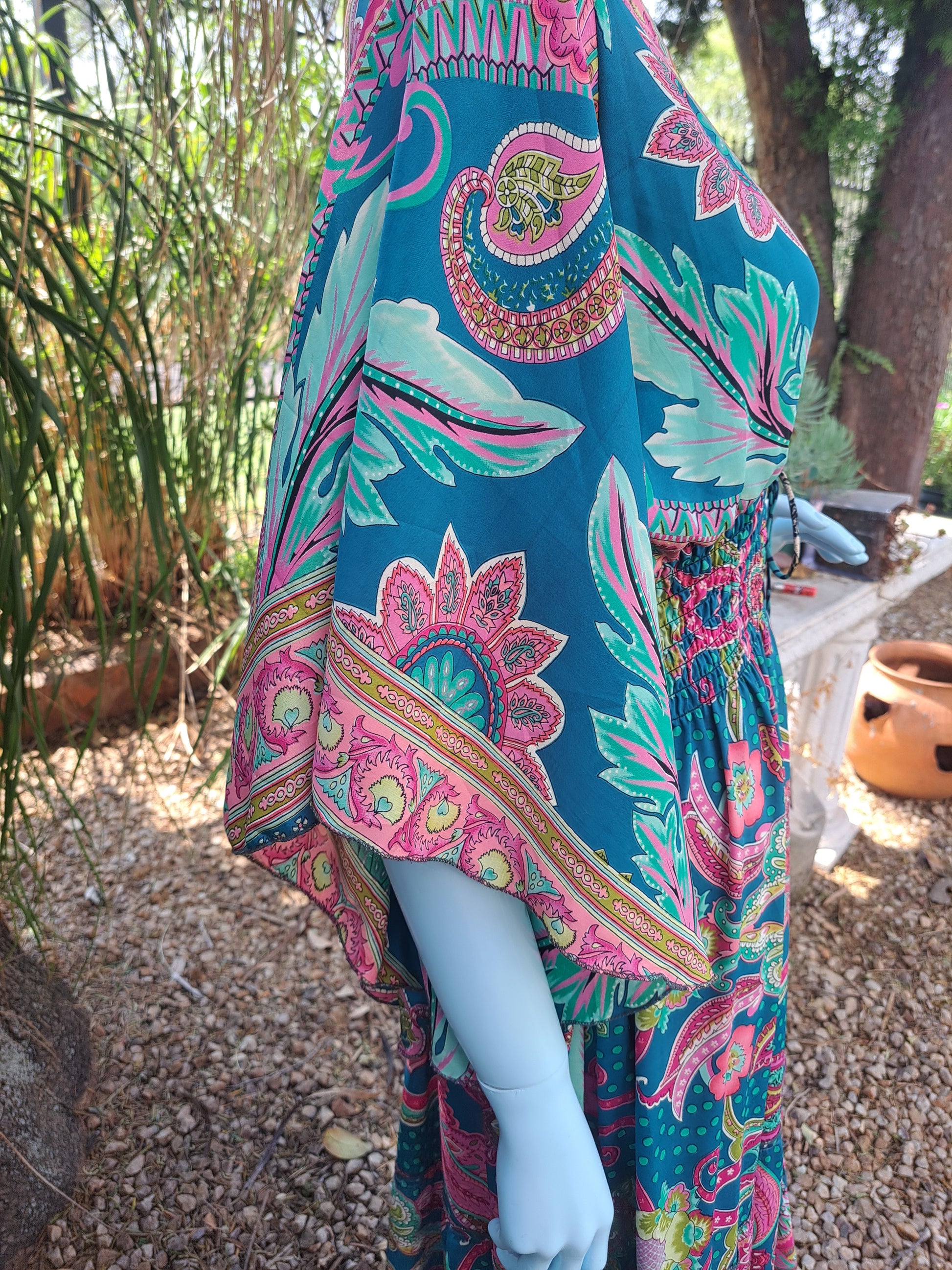 Beautifully sculpted with a flared sleeve and rouged waist. Be the Belle of the Ball in this Gracious Goddess cut in Emerald and Pink with gold leafing detail.