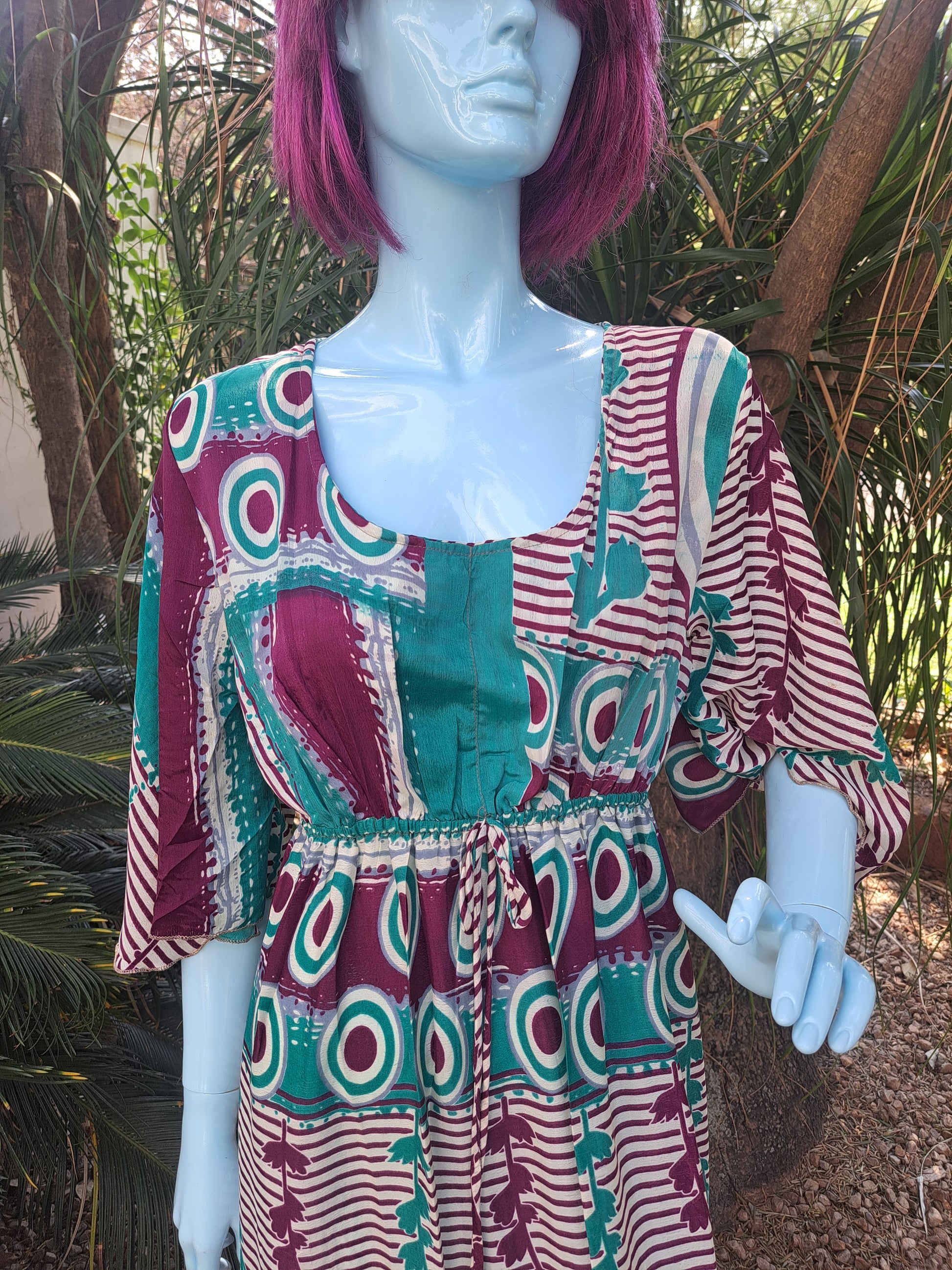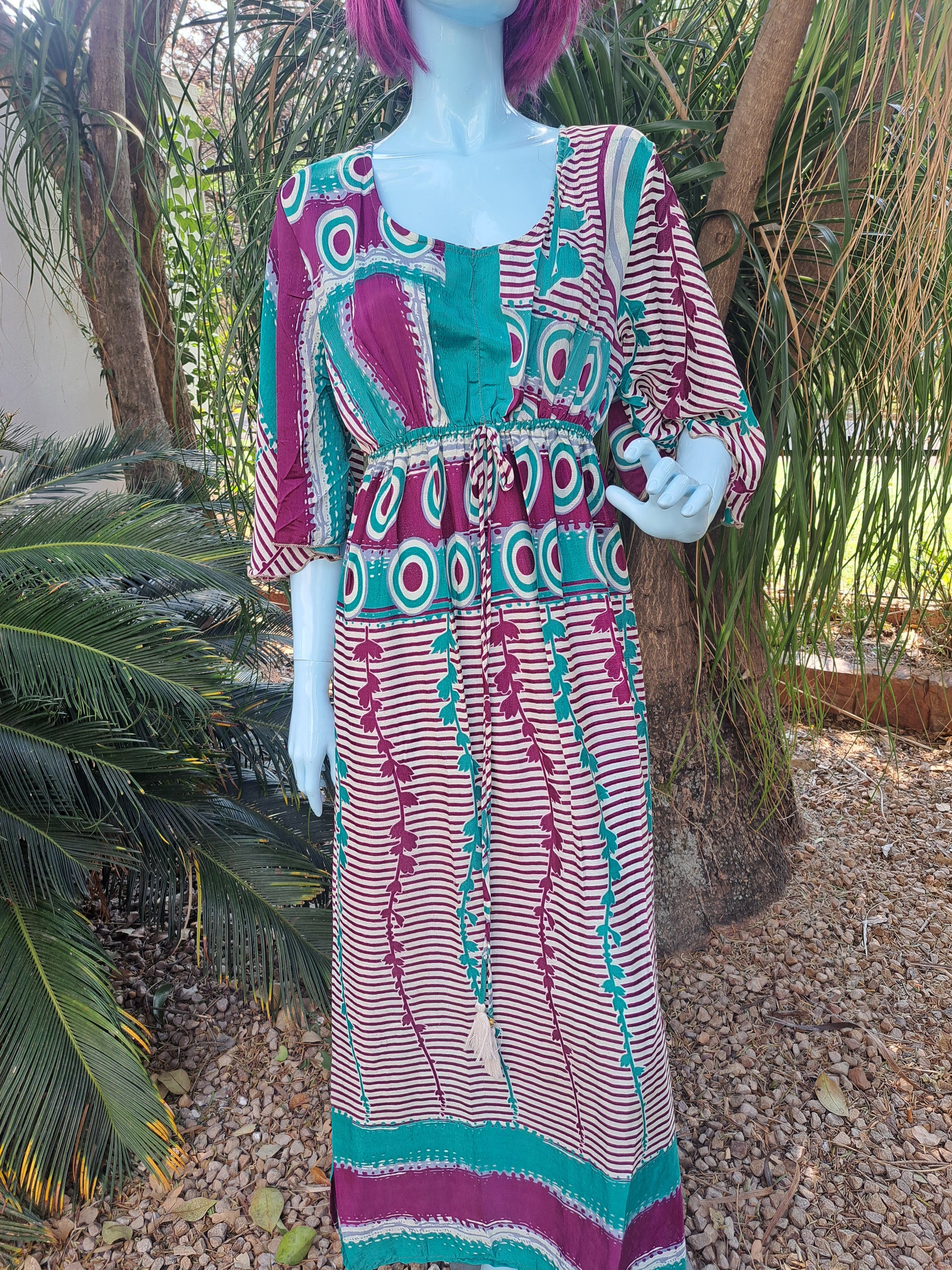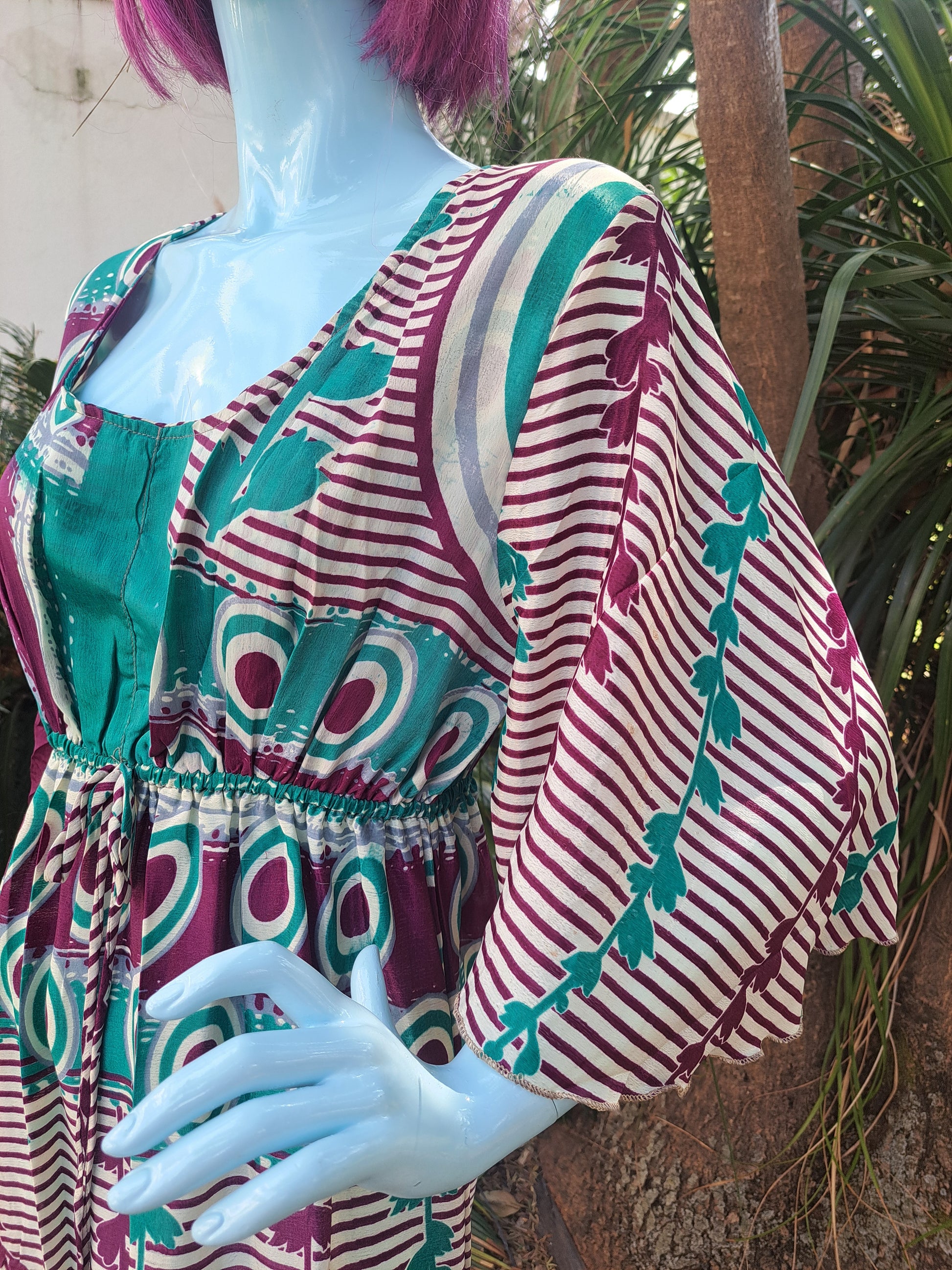 Plum and Turquoise play together in this Empire cut. Elasticated waist with drawstring detail, bell sleeve for feminine softness. Elegant but simple.
