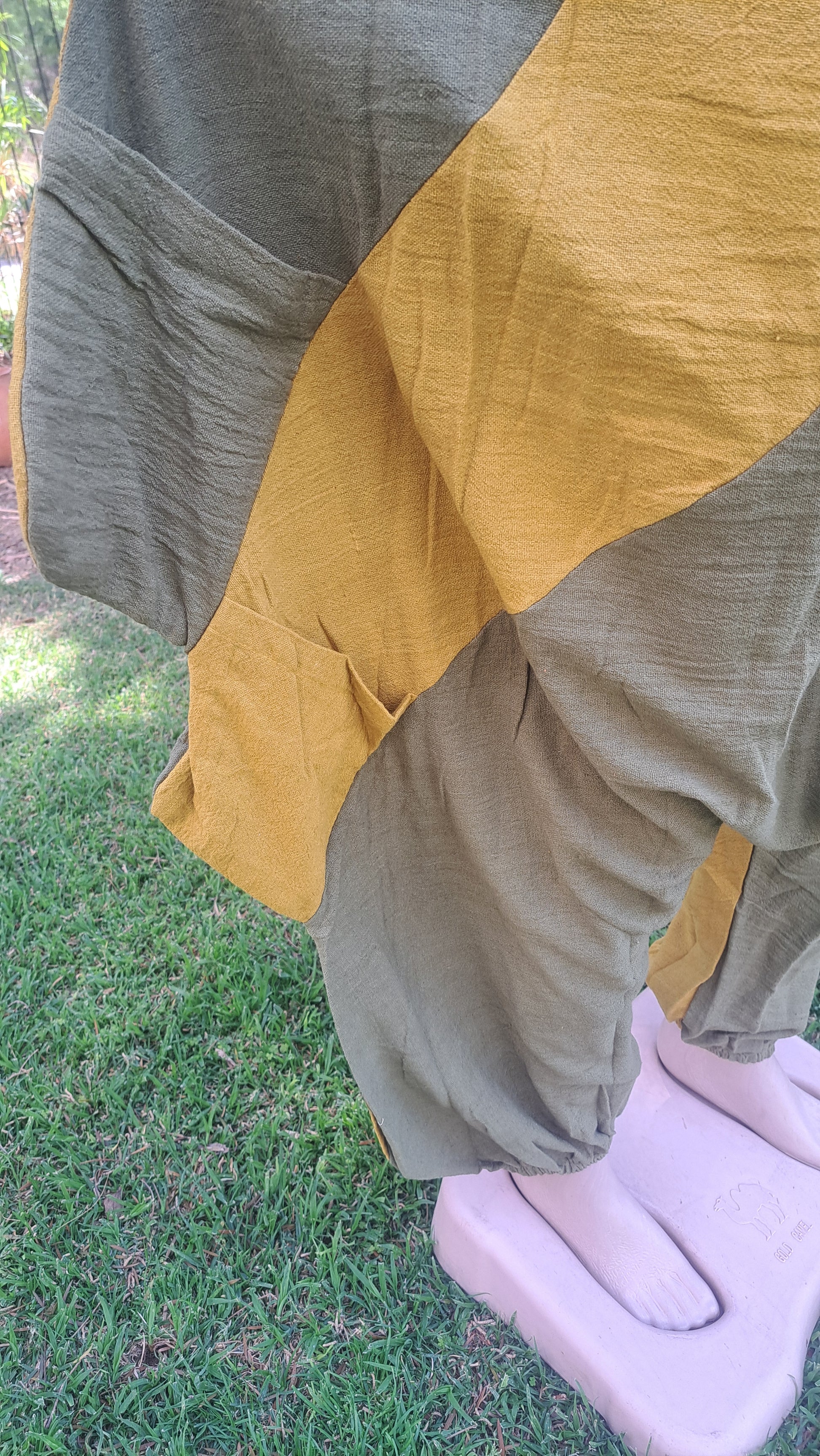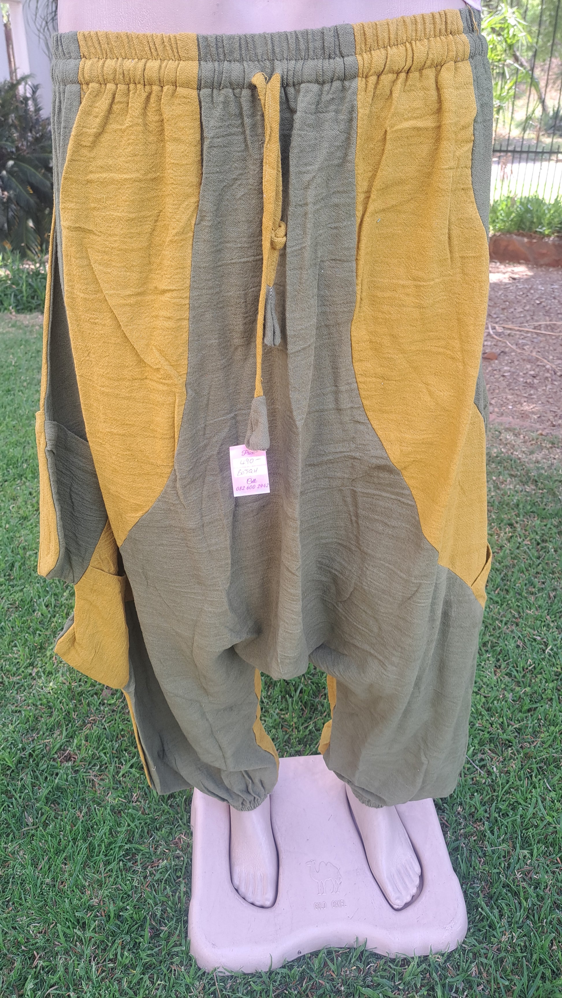 Raw cotton Aladdin pants with raw style. Earthy tones and textures, lots of pockets and a combination drawstring and elastic pants. Creative fashions from India.