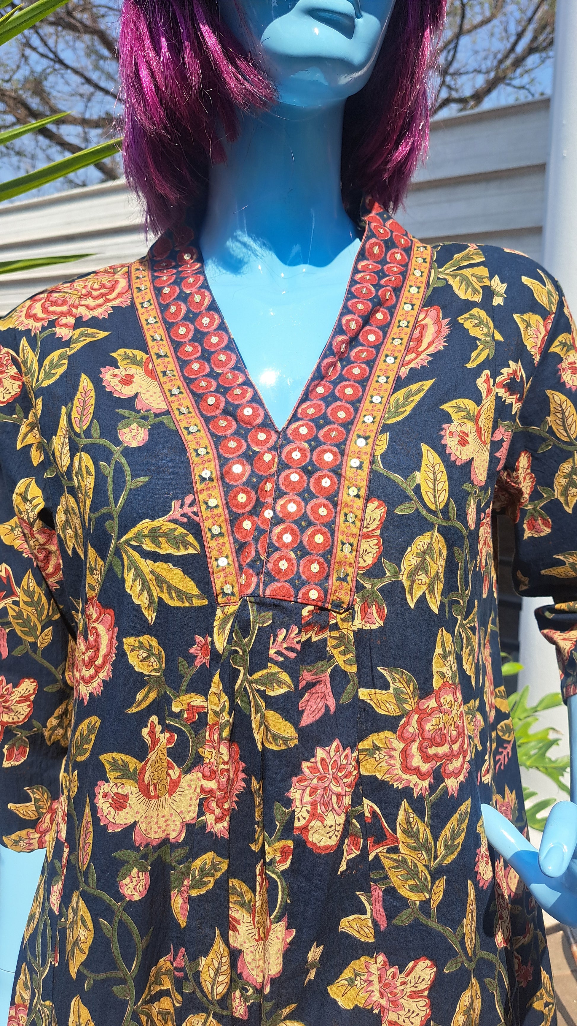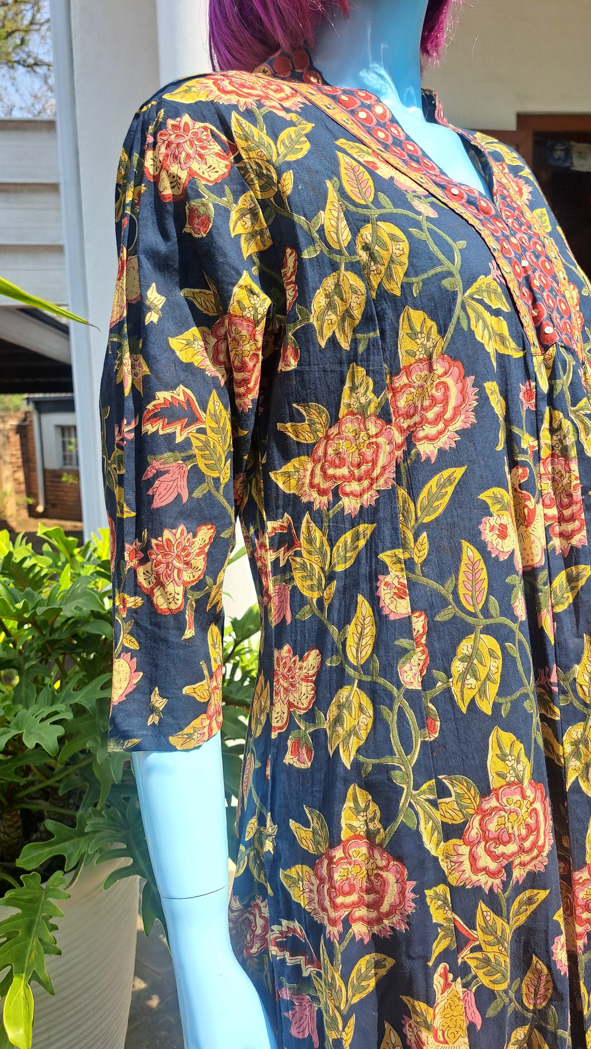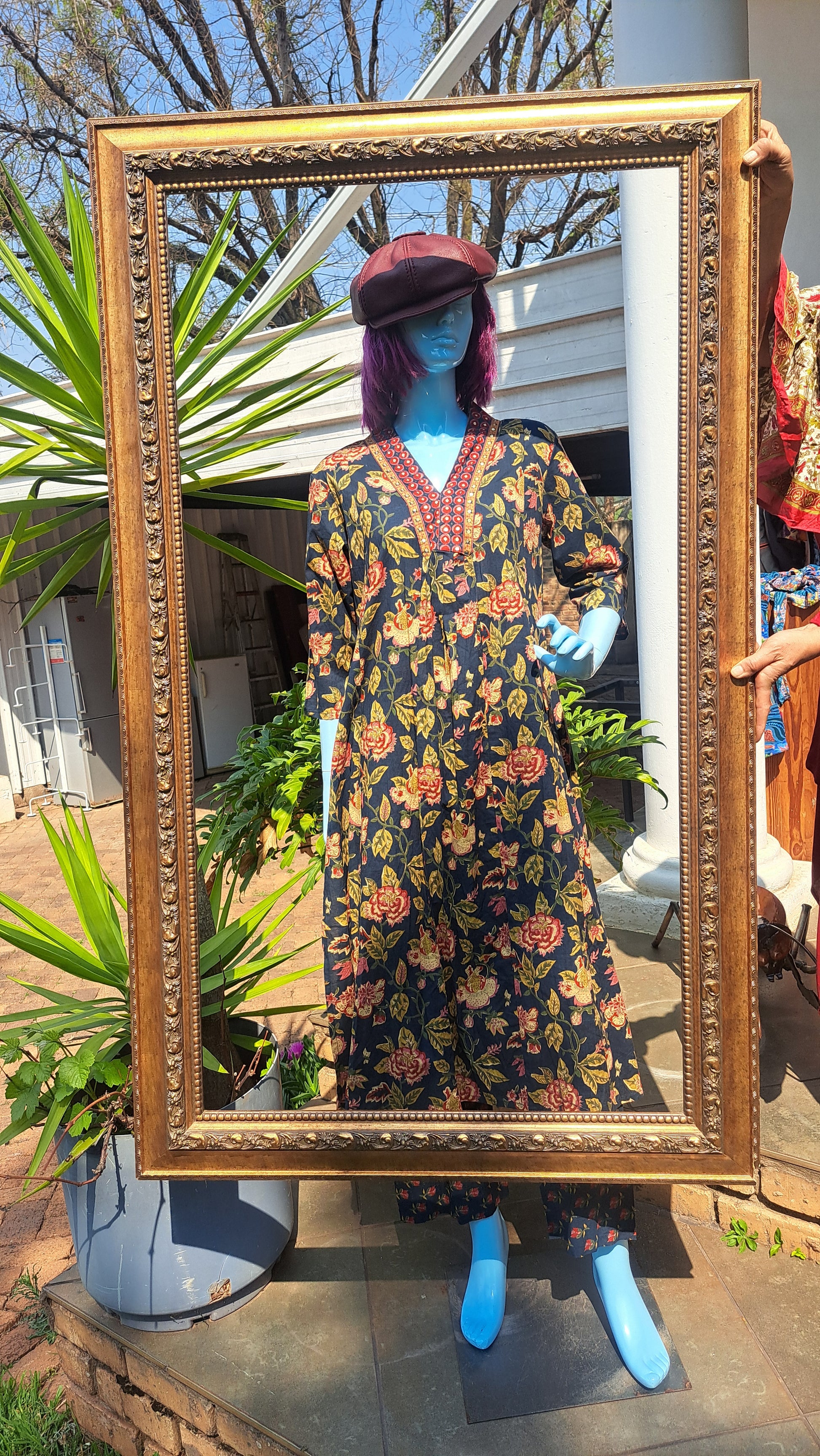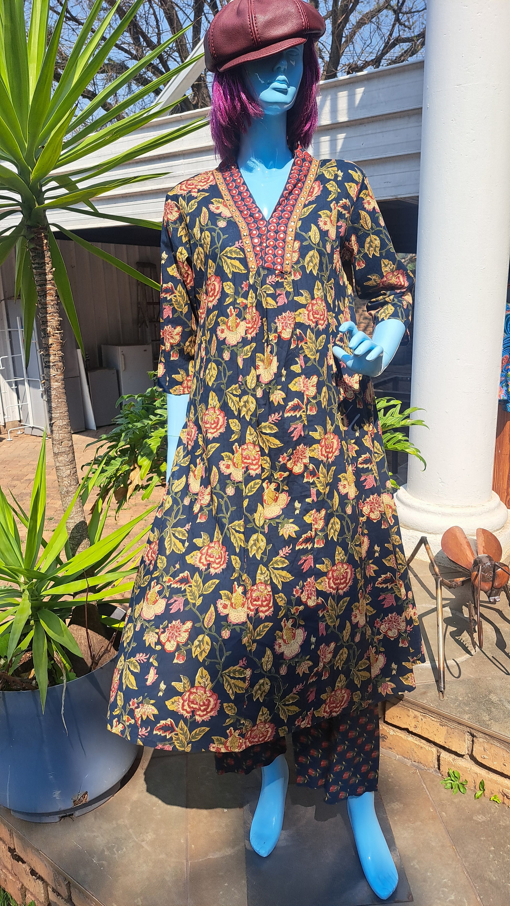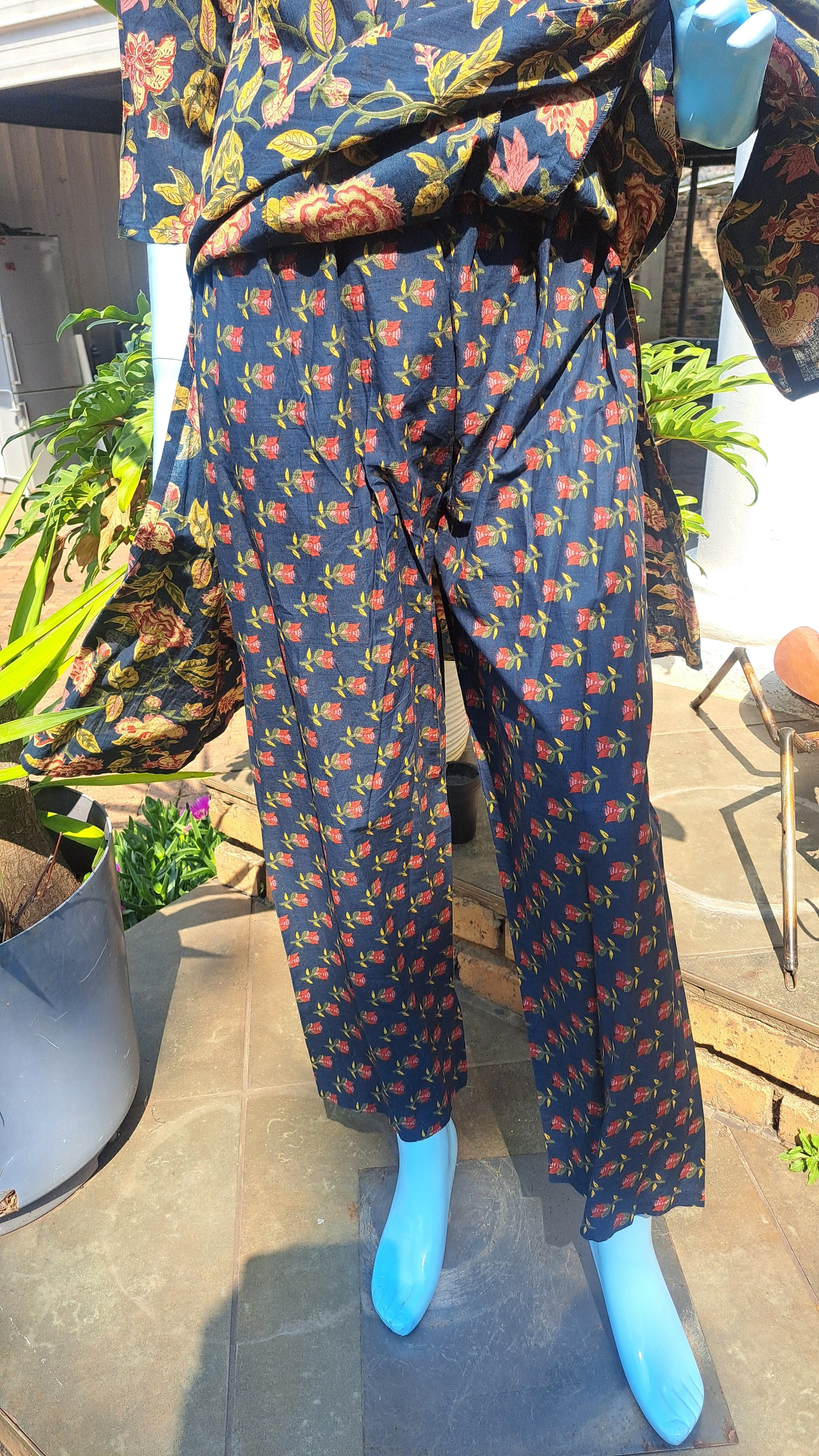 So much to love in this cotton 2 piece. Rich bronzes and navy blend beautifully with rich, deep reds and olive green vines. Floral print pants play with matching colours of offmatched prints. What a classical duo.