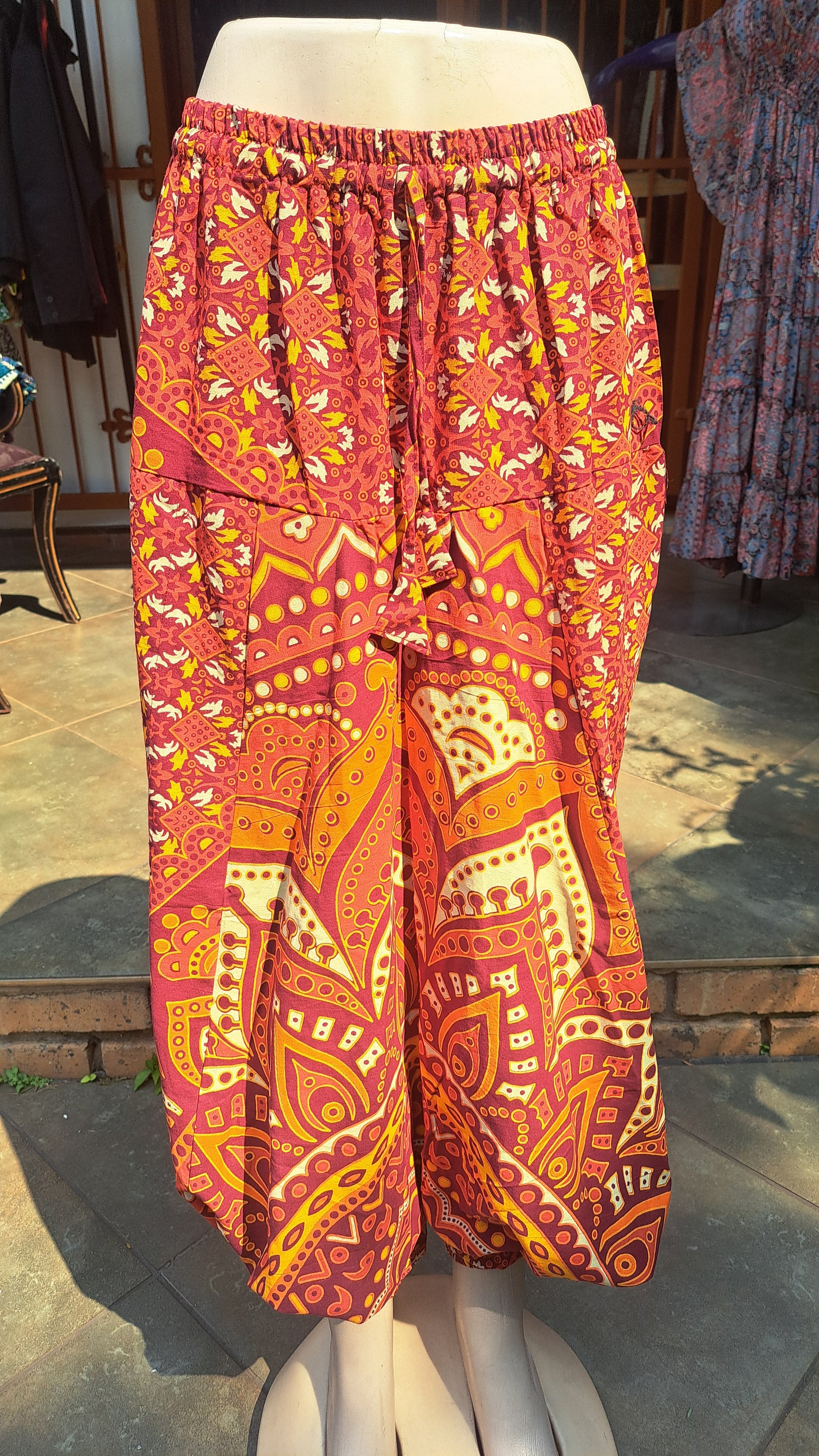 Call it what you will, Aladdin, Harem, Alibaba. Its comfort in cotton with bold prints, elastic and drawstring waist, elastic ankle and low crotch freedom.