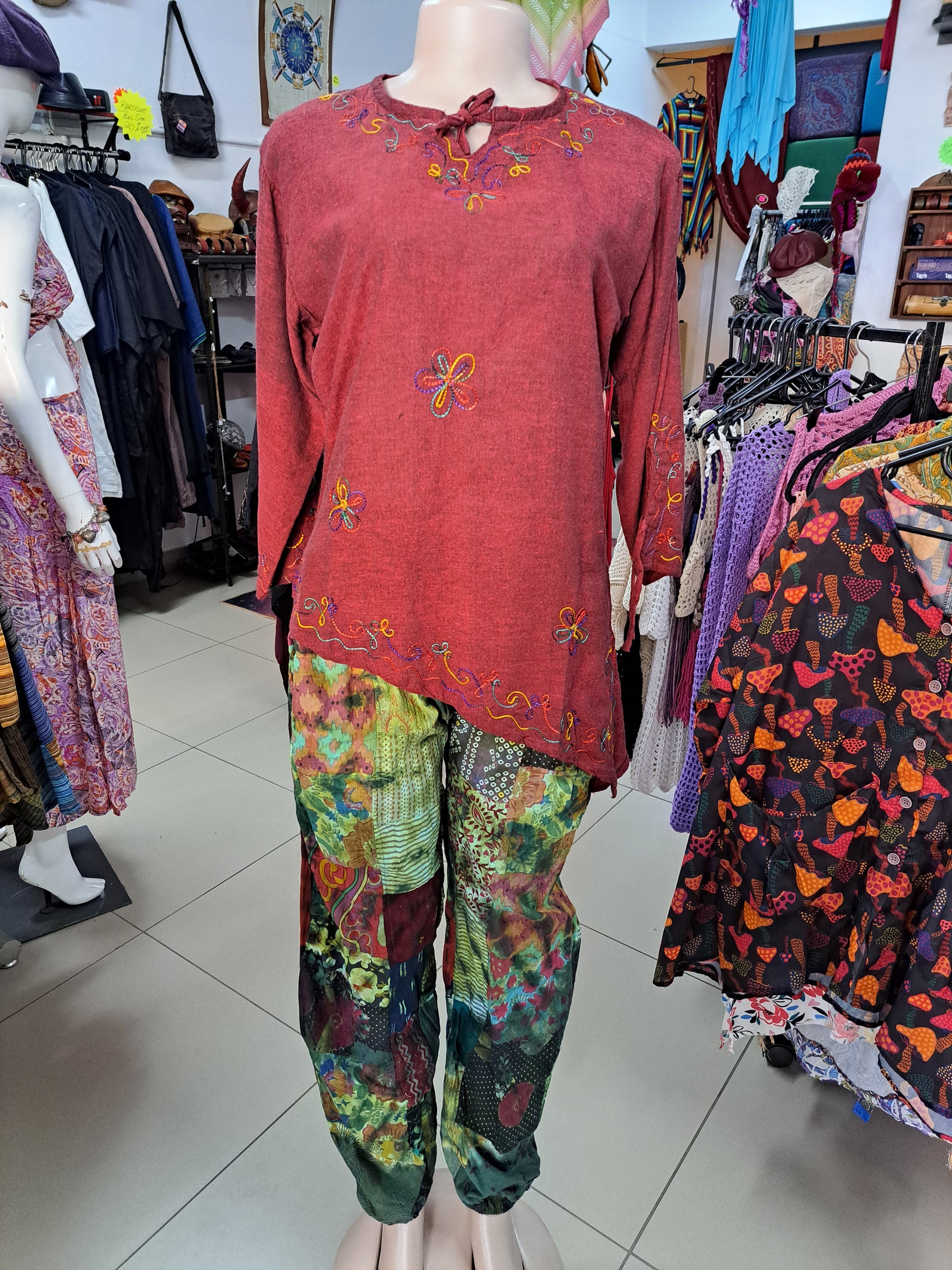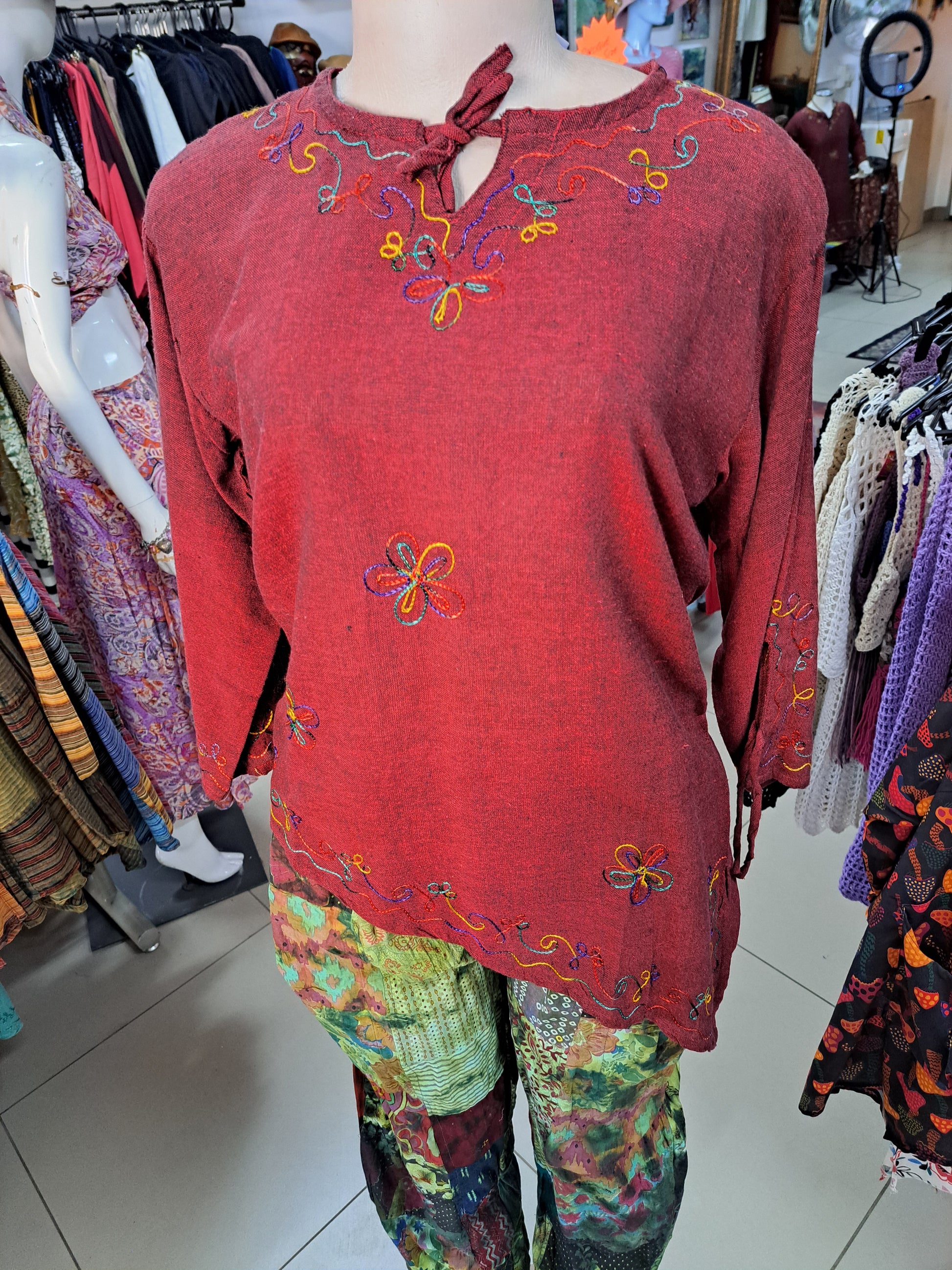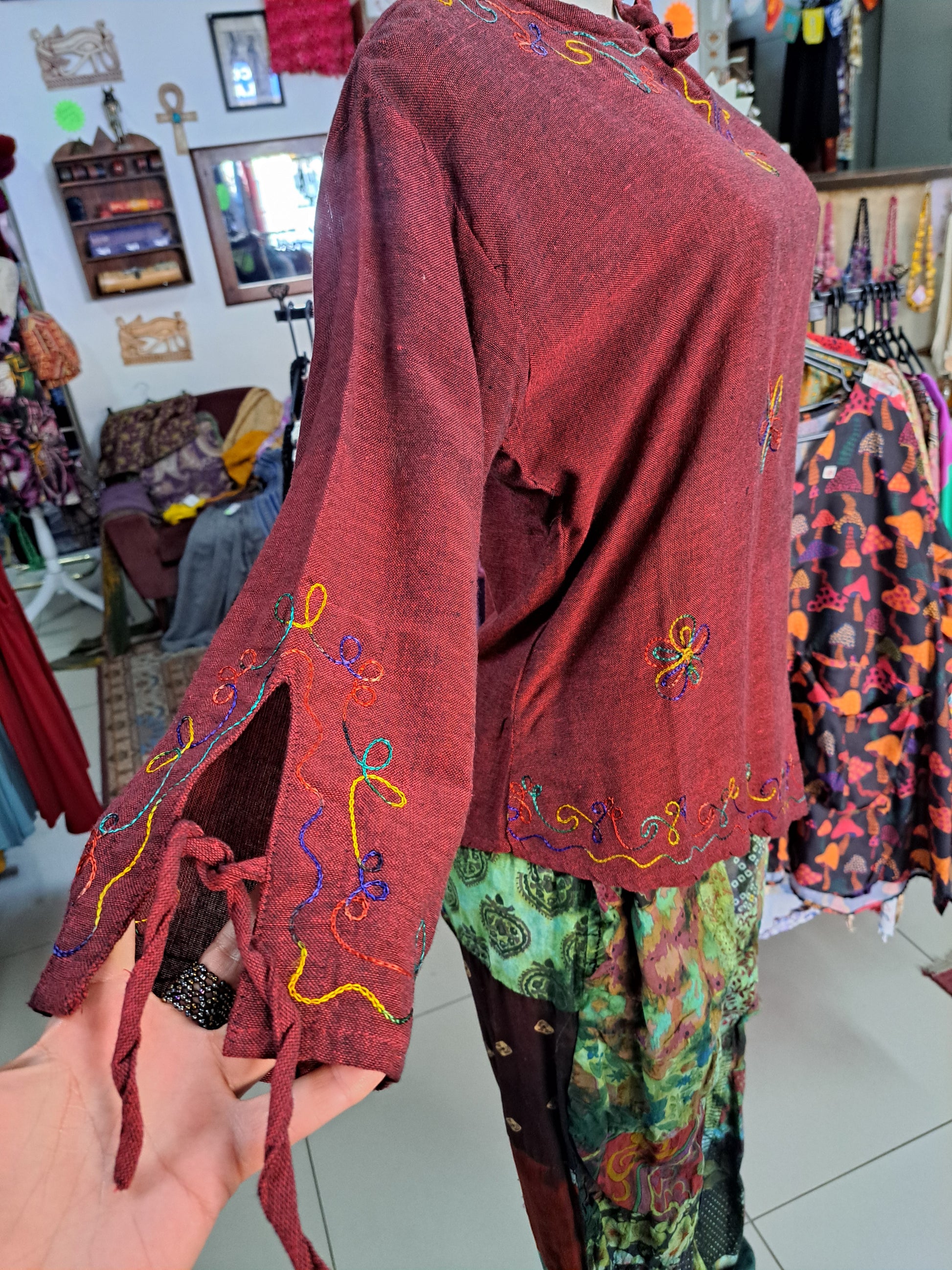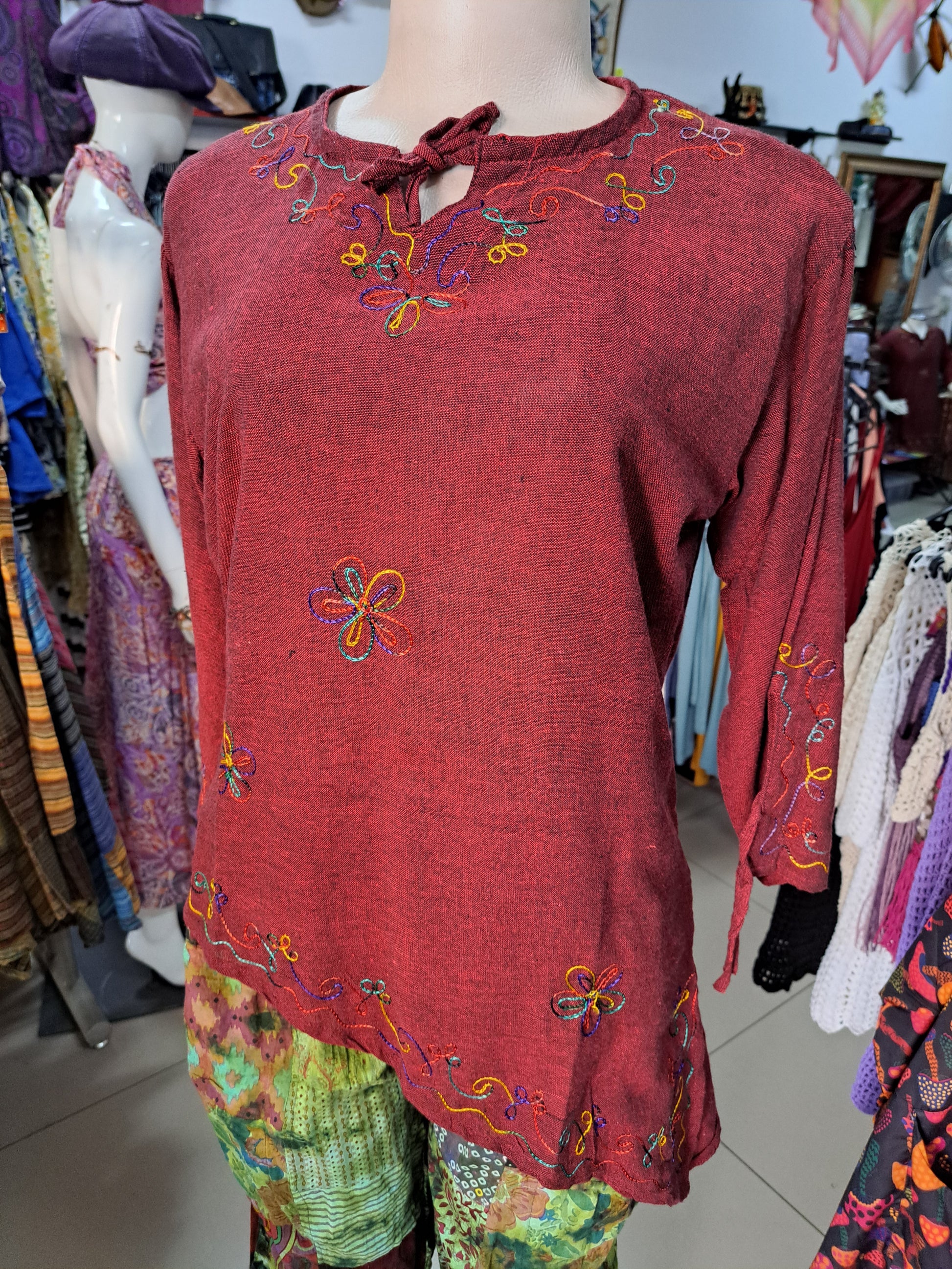 Straight from Kathmandu, Nepal, a beautifully embroidered blouse with detailed 3/4 sleeves. Asymetrical hip detail brings a new line to your feminine form. Pair her with a denim or a skirt. Dress her up or dress her down. Coolest cotton.