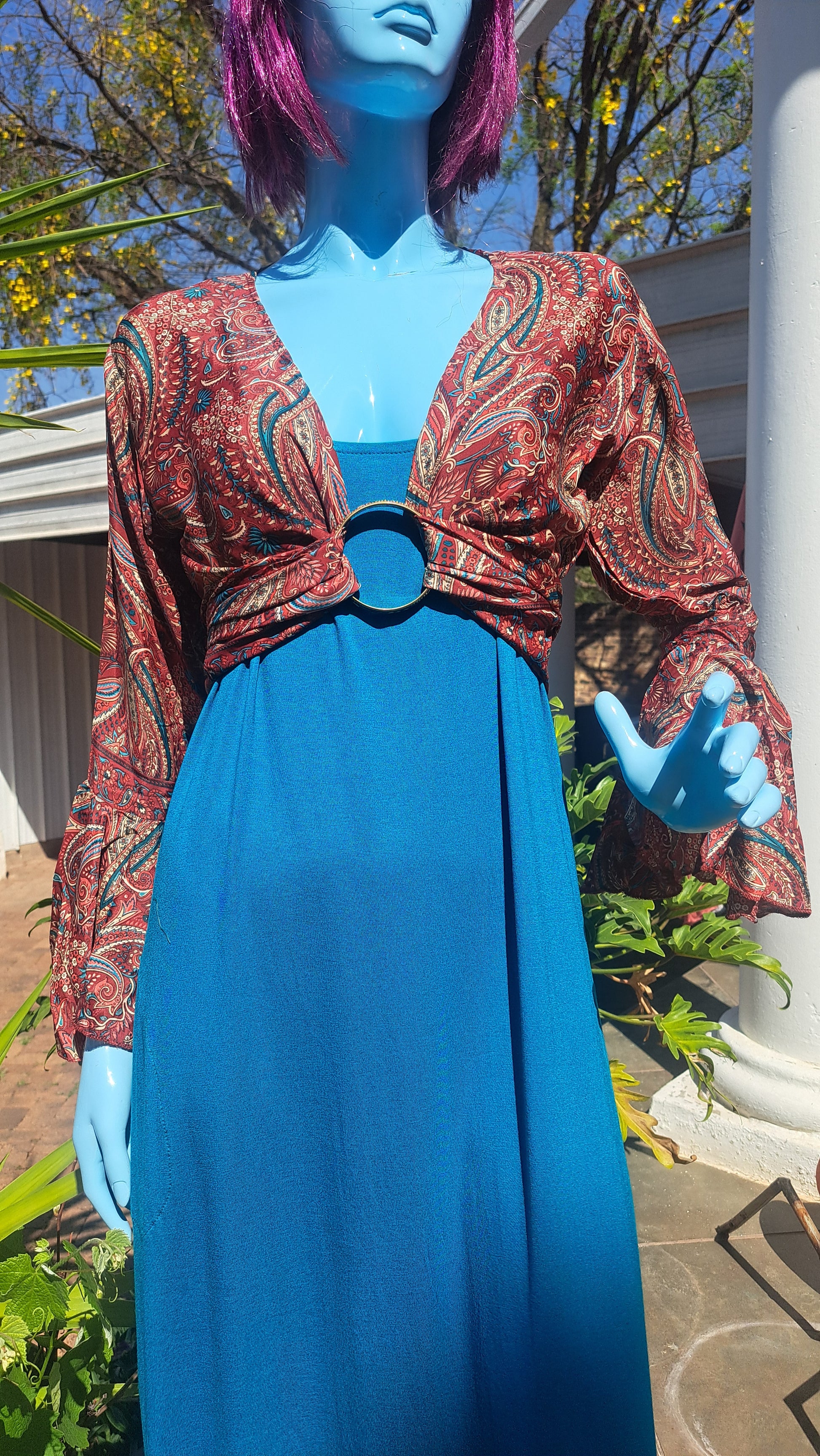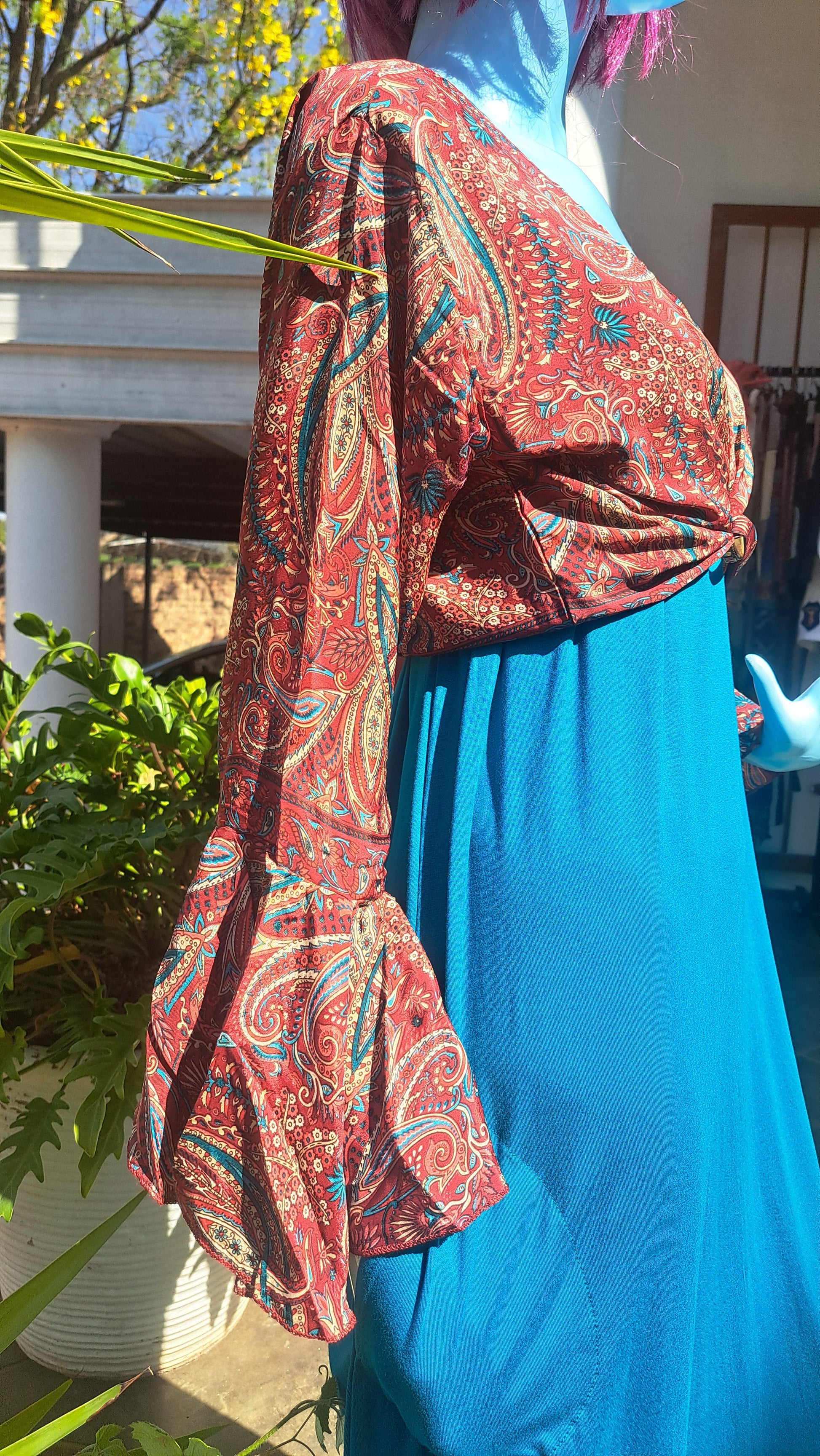 A Scalloped sleeve wrap top with at least 8 different tie methods. Play with the looks. Pair with a denim, over a plain dress, with a wide skirt. Live it up Gypsy girl!