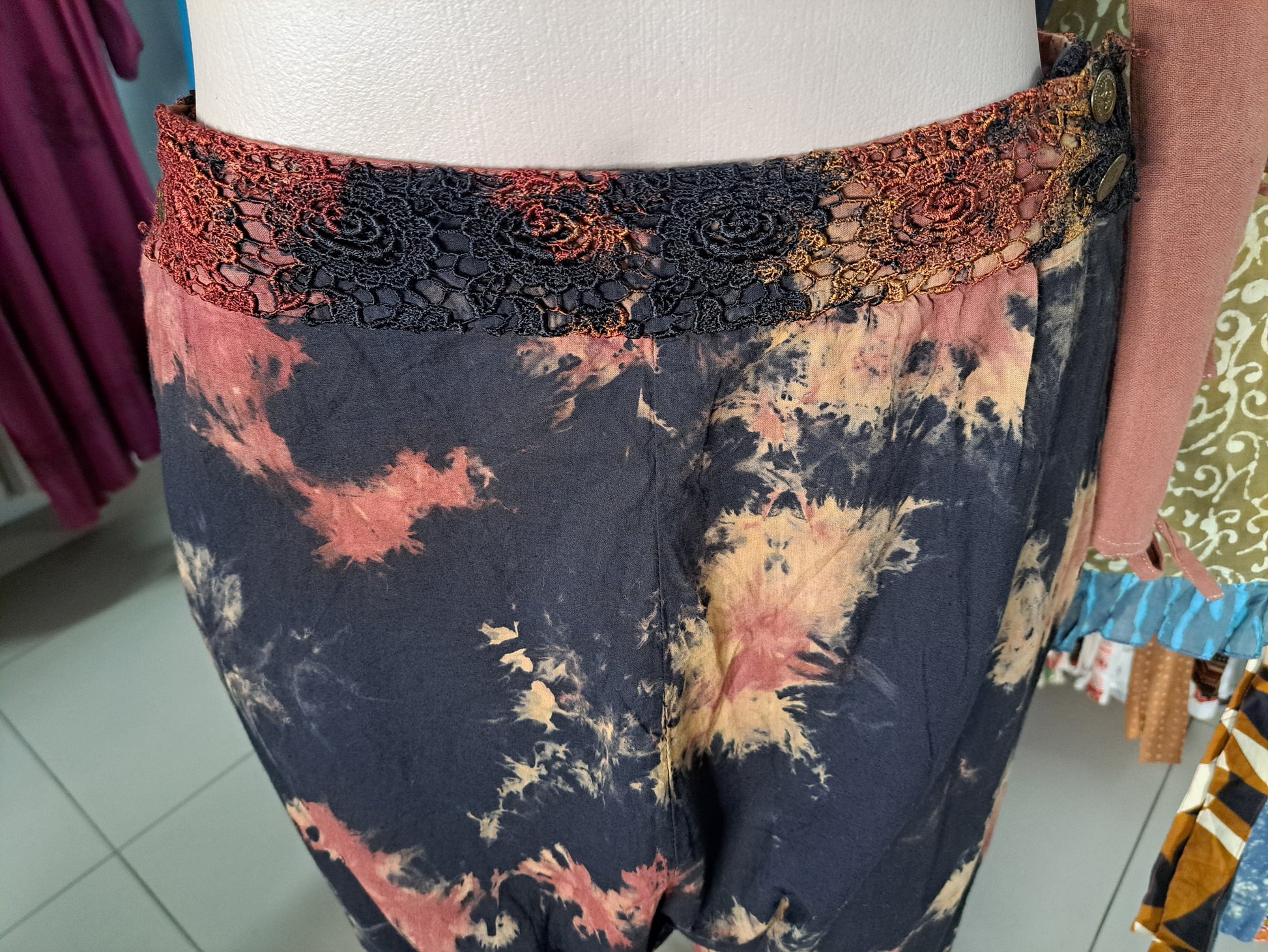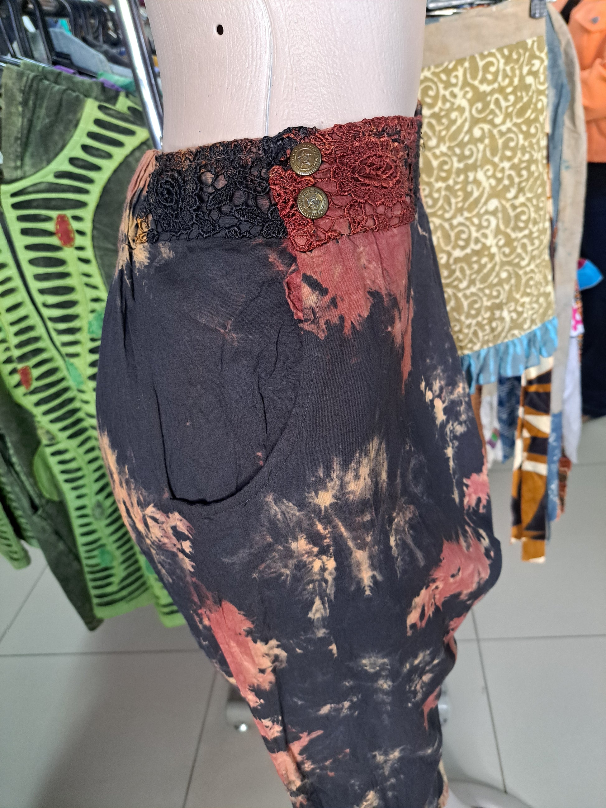Hipster cut, tapered leg pants in rusty tie dye. Embroidered details on the waist, pockets and cool comfort.