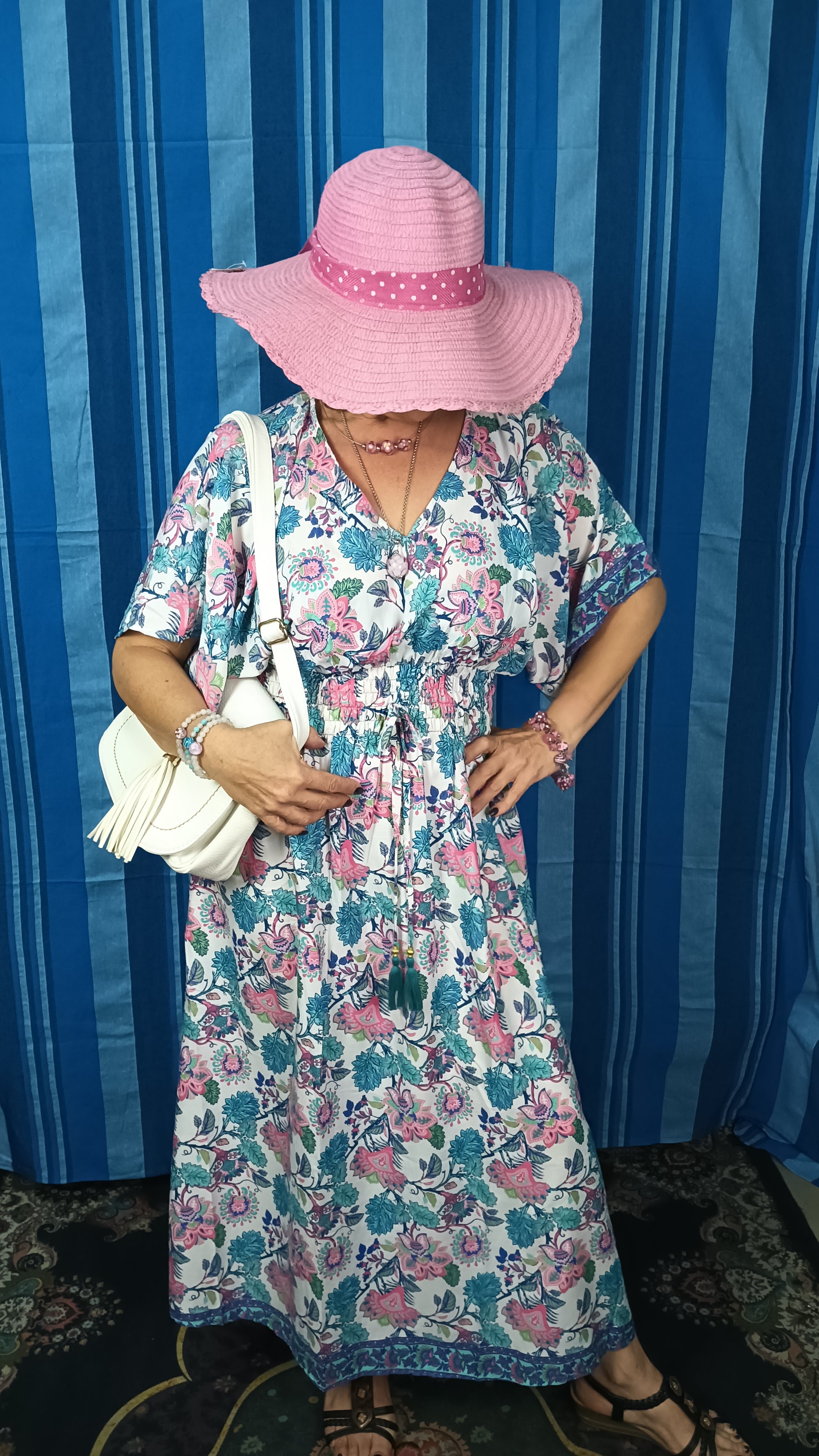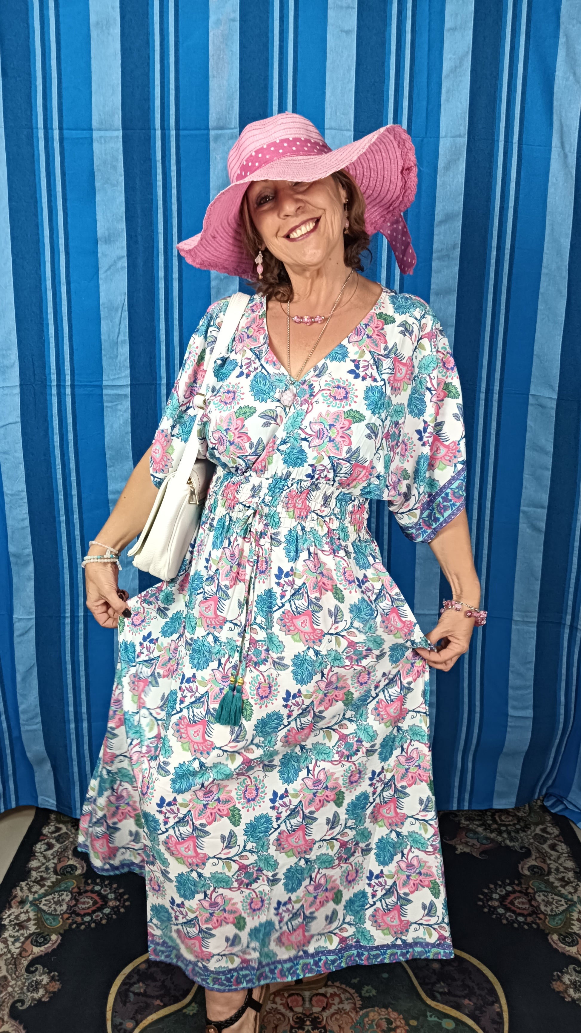 Floral explosion in a empire cut silky dress. Slip on accessories and sandals. Nothing else required. Shopping days, holidays and tea parties.